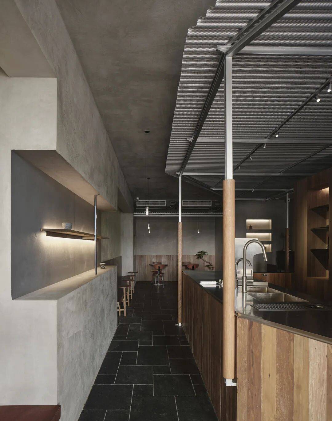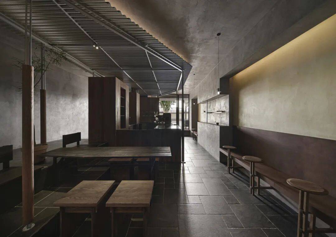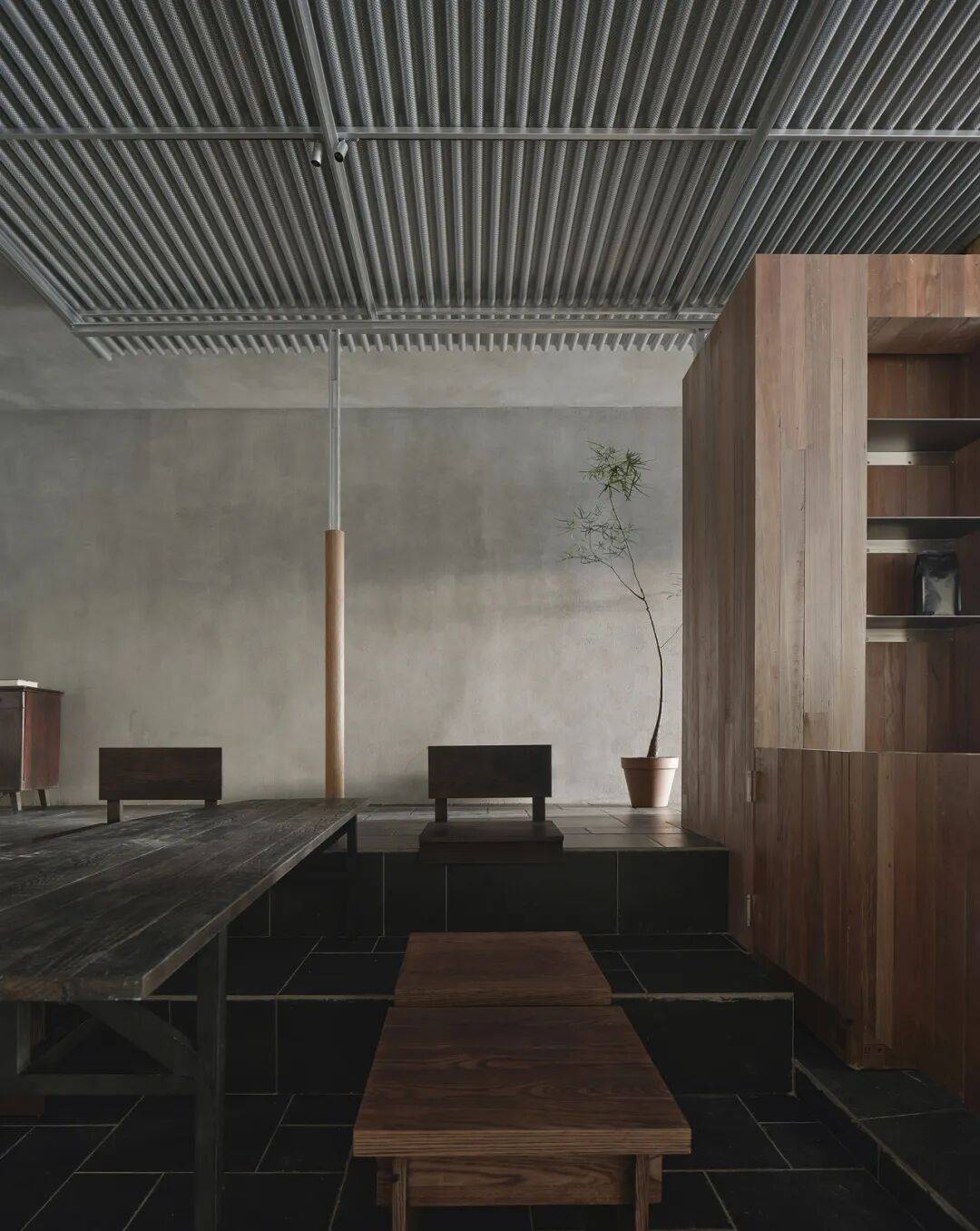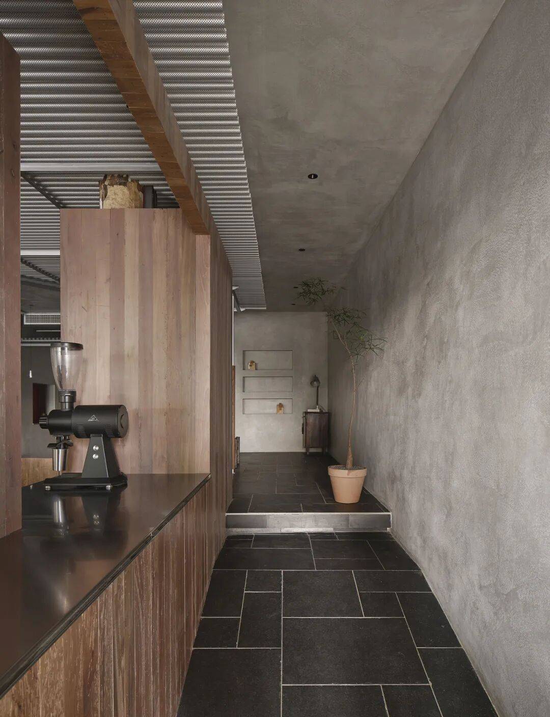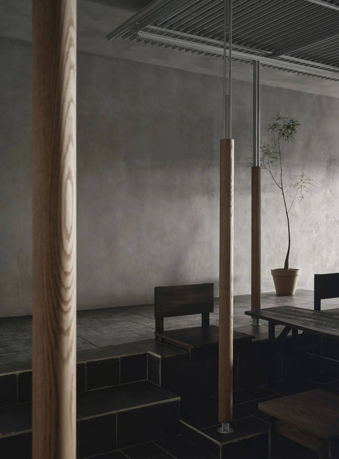 雨棚是南京老城区街头随处可见的临建元素,设计师选取雨棚形象作为设计元素,建立室内与街巷的联结。室内有两处雨棚,一处是吧台区,是咖啡店公园感的核心要素;一处是在双人座位区,单坡雨棚划定相对私密区域,檐下立柱强化空间构造秩序。“雨棚”的屋面采用波浪形冲孔铝板,提升透光性和空气流动性,稀释厚重感,使空间氛围更加当代。雨棚的细柱采用钢木结合建造方式,在柱础和柱梁交接位置,扁钢与木杆拟态燕尾榫,将传统木构节点形式转译并使用在工业材料上,形成独特有趣的现代语汇。木构形式也被运用到家具节点上作视觉点缀,如卡座旁的小圆桌和定制长桌,在保持家具整体利落干净形态的同时增加意趣。