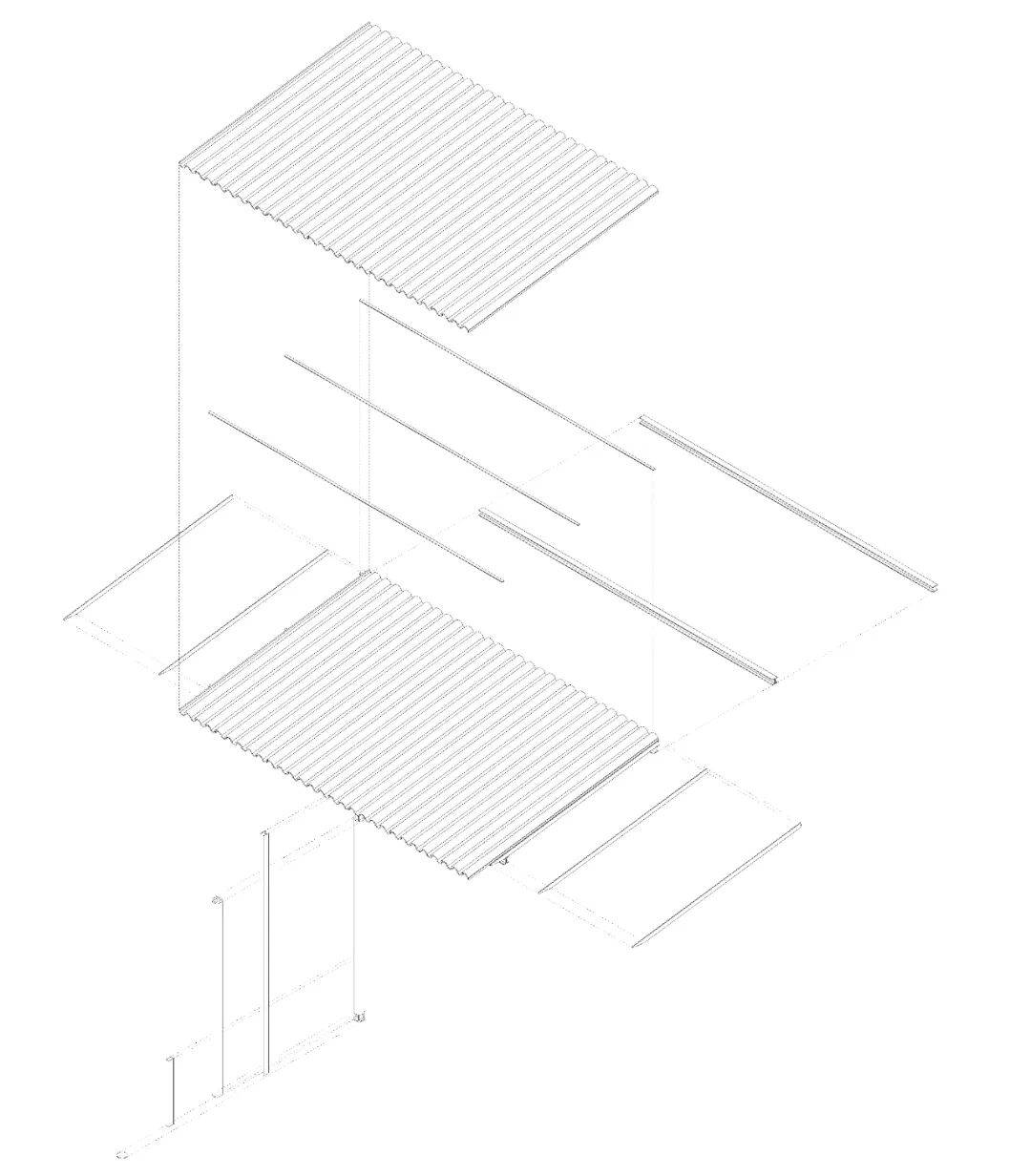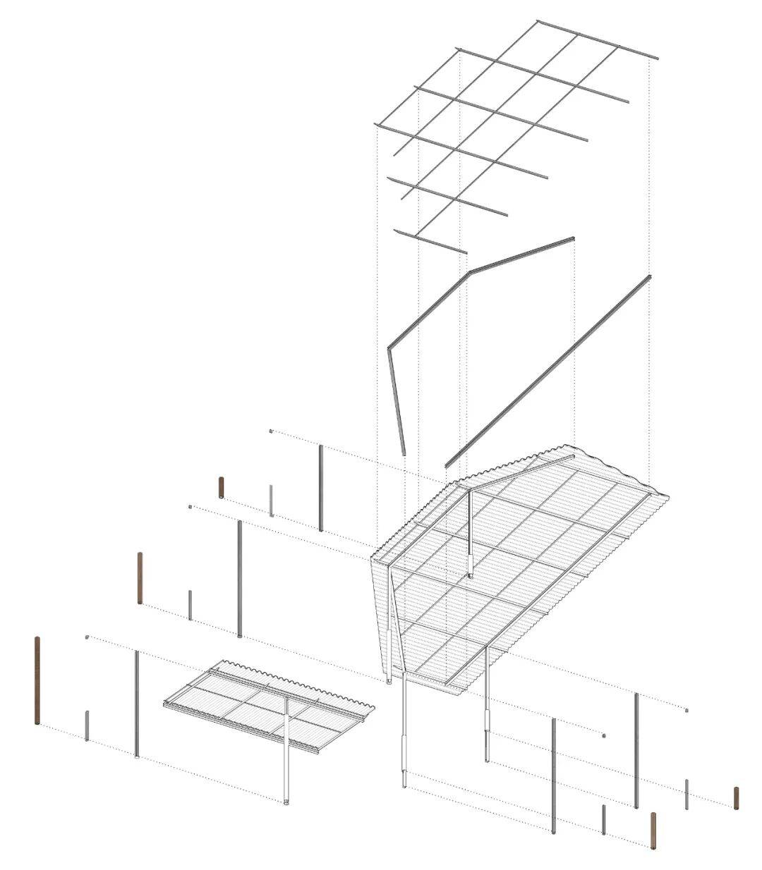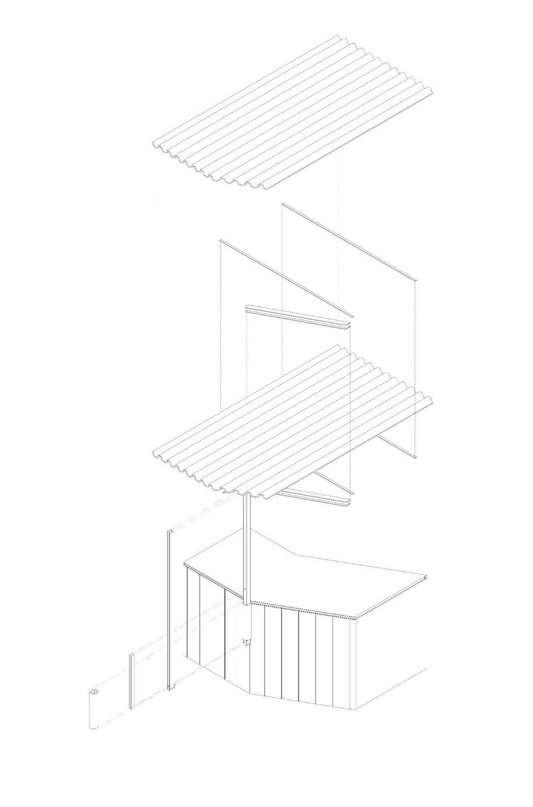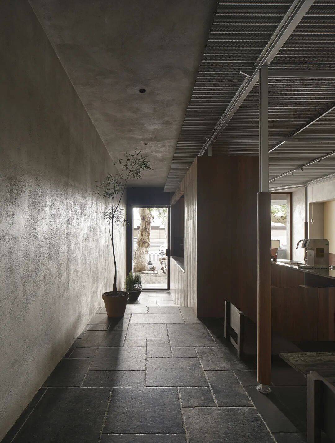 雨棚是南京老城区街头随处可见的临建元素,设计师选取雨棚形象作为设计元素,建立室内与街巷的联结。室内有两处雨棚,一处是吧台区,是咖啡店公园感的核心要素;一处是在双人座位区,单坡雨棚划定相对私密区域,檐下立柱强化空间构造秩序。“雨棚”的屋面采用波浪形冲孔铝板,提升透光性和空气流动性,稀释厚重感,使空间氛围更加当代。雨棚的细柱采用钢木结合建造方式,在柱础和柱梁交接位置,扁钢与木杆拟态燕尾榫,将传统木构节点形式转译并使用在工业材料上,形成独特有趣的现代语汇。木构形式也被运用到家具节点上作视觉点缀,如卡座旁的小圆桌和定制长桌,在保持家具整体利落干净形态的同时增加意趣。