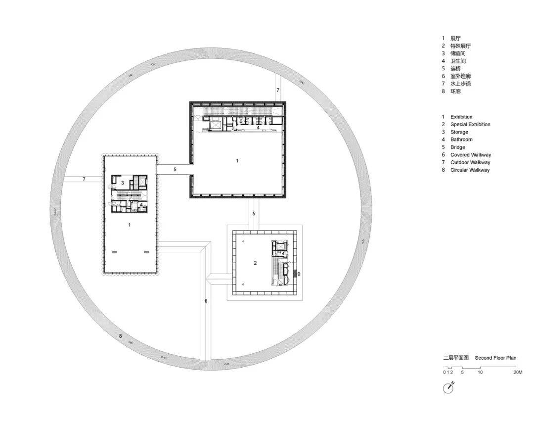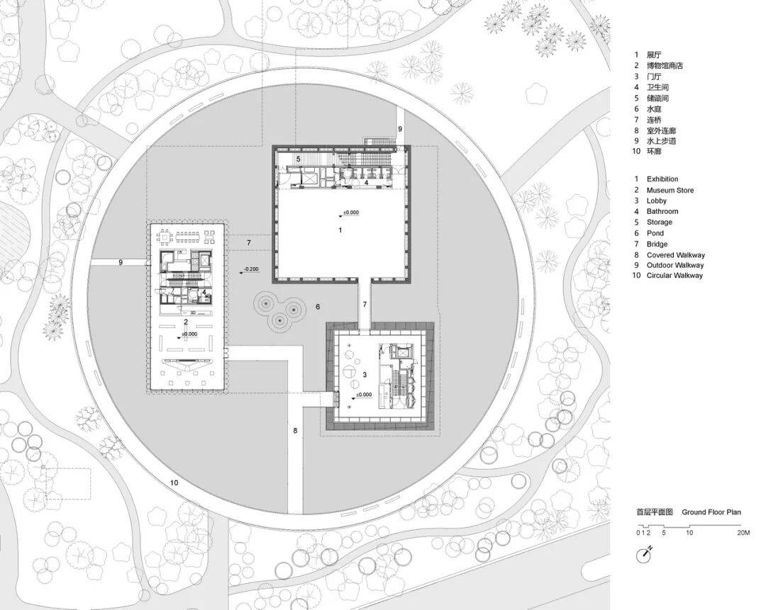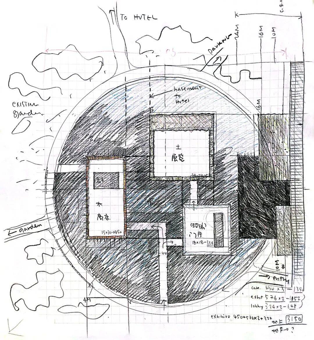 舍得文化博物馆位于四川射洪舍得酒厂的东花园中,射洪位于四川盆地底部,常年气候湿润、绿意盎然,酒厂被纯净的自然山水环抱,拥有得天独厚的生态条件。建筑师发现了东花园靠近公路和厂区入口但使用很少的特点,将其作为未来公众与酒厂的连接界面。设计始于选址和造园,将一个直径90米的圆形水池嵌入现有花园,以视觉上半透明的环廊围绕水池,水中有安静的涌泉和等离子喷雾装置。圆无棱角,顺畅地融入周围园景,为新博物馆建筑营造出静谧诗意的独立场地。