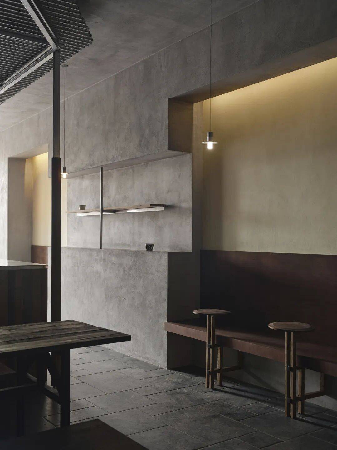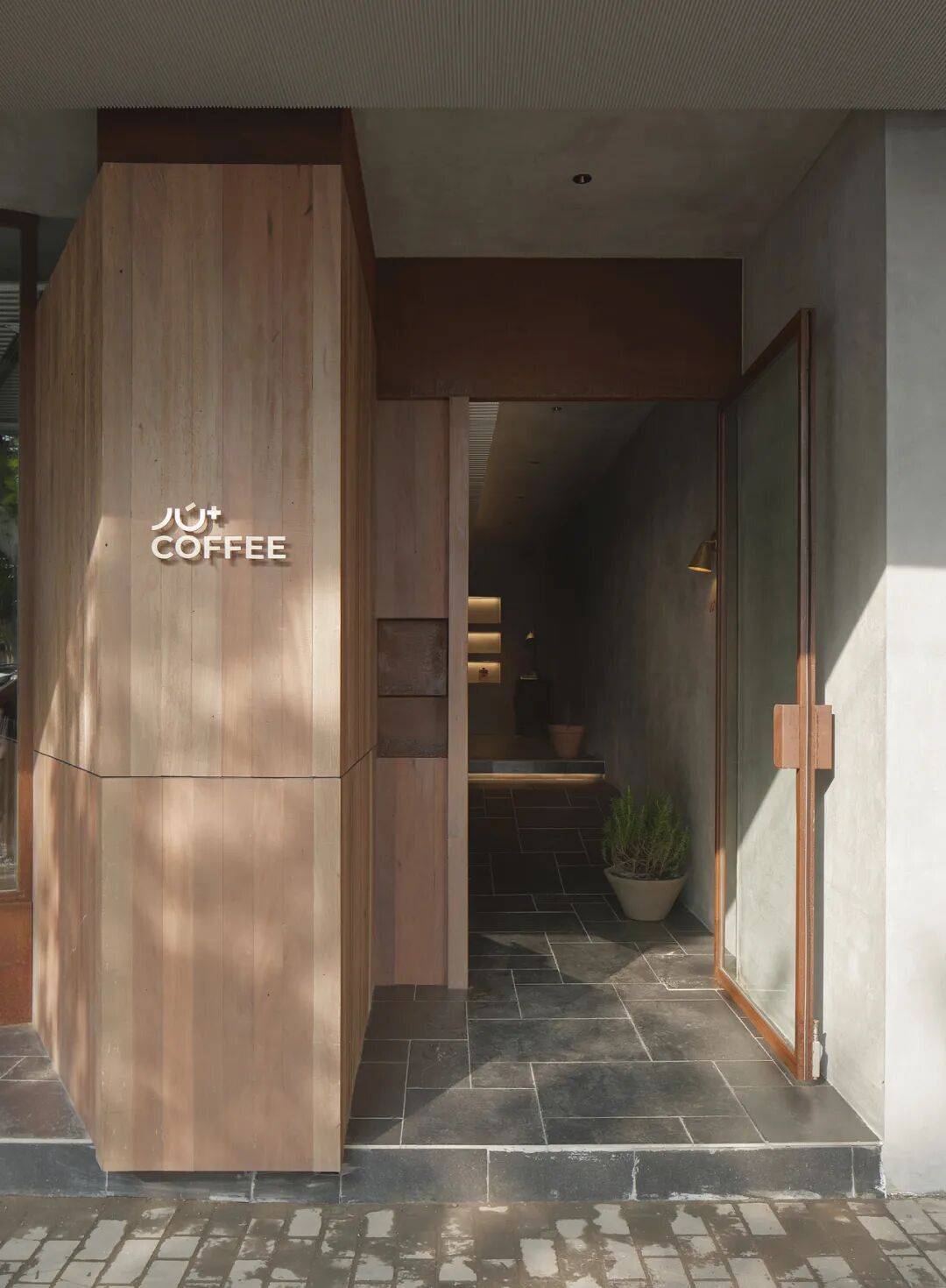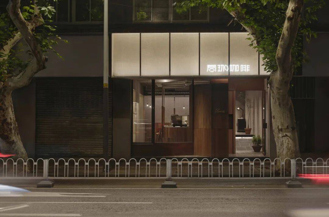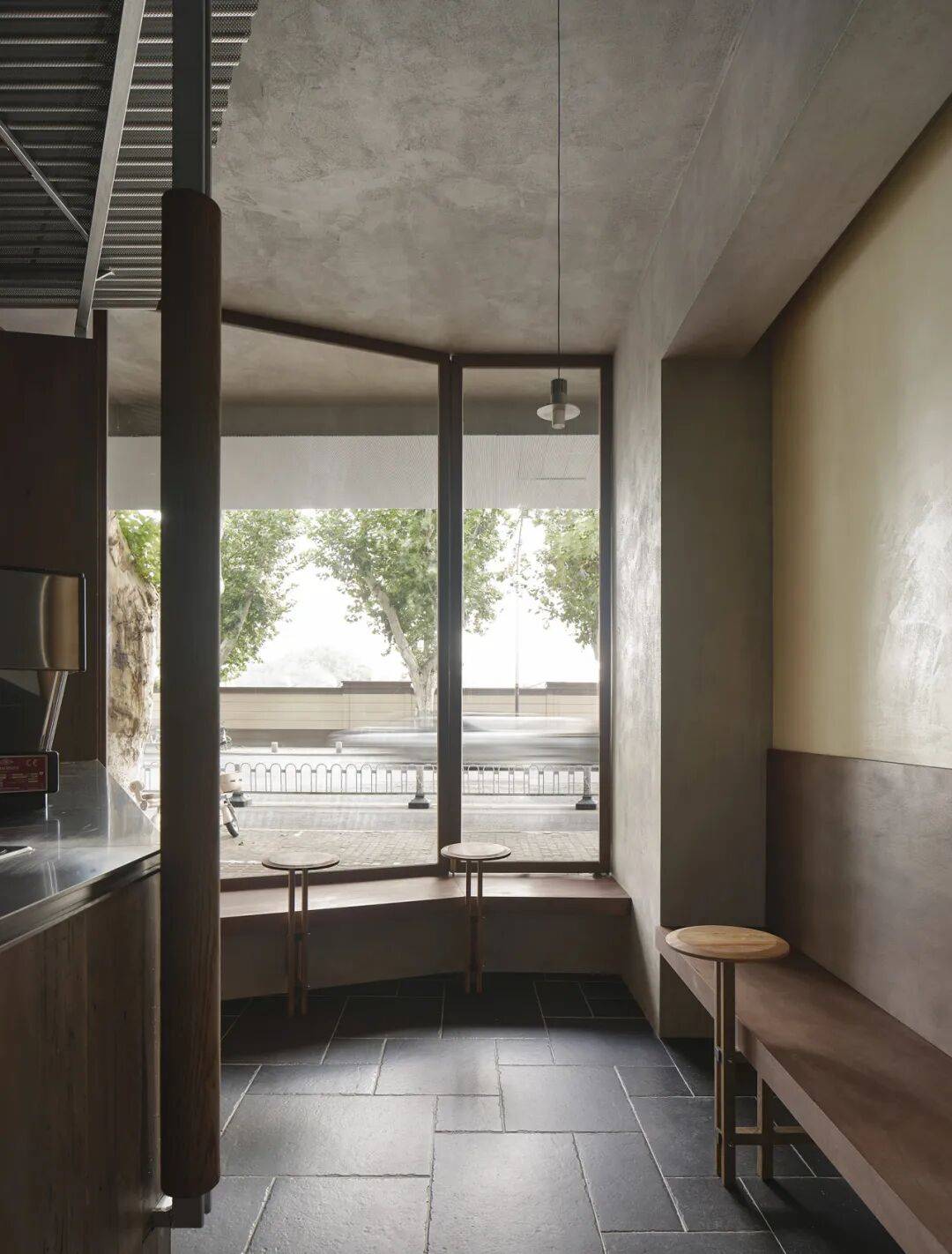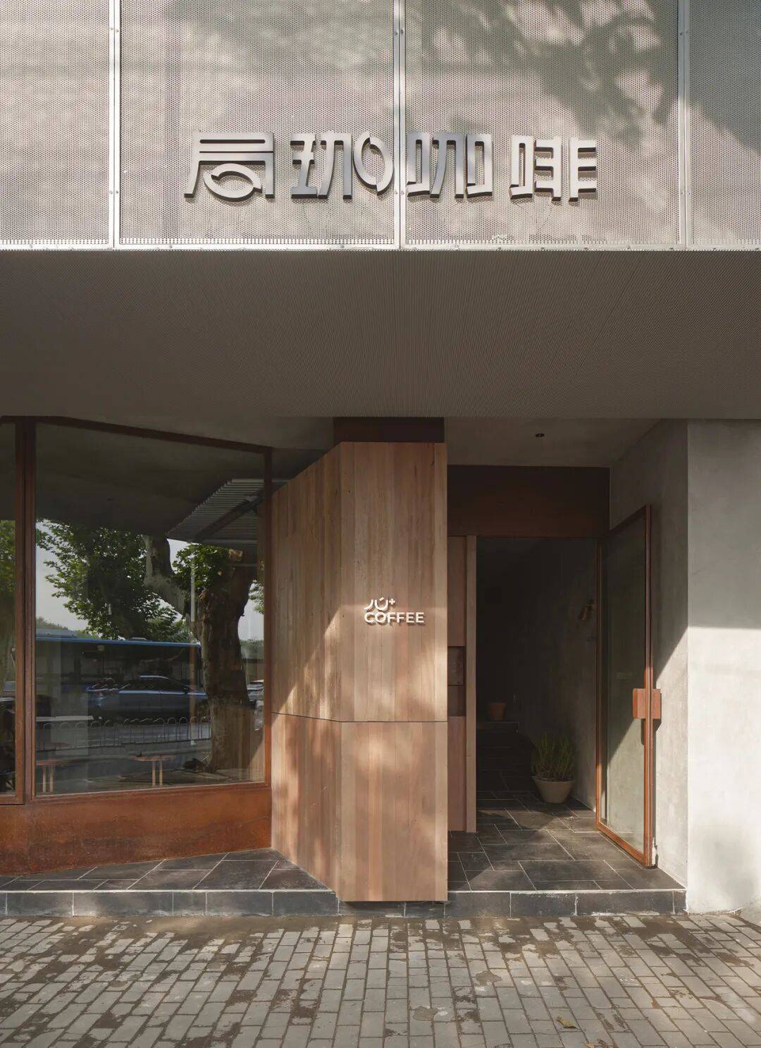 社区公园曾是年轻人获得松弛感的重要场所,跳舞、读诗、逛公园是80年代青年的集体记忆。局珈咖啡希望褪去下午茶文化的精英感,回归到更日常的氛围,重拾公园的气质。在立面材料的选择上,采用了耐候钢板和老木材,突出质朴和易得性;门头材料则选用冲孔网,强化光线透出与视觉开放性。左侧立面窗口向内凹进,屋檐下灰空间配以围合卡座,呼应门口的梧桐树形成视觉焦点;右侧入口窄门旁设置翻板小方窗,既便于外带顾客取餐,又使咖啡店形象变得亲切。这些设计细节都让局珈咖啡仿佛是一个街头的小公园,为人们提供了一个放松身心的场所。