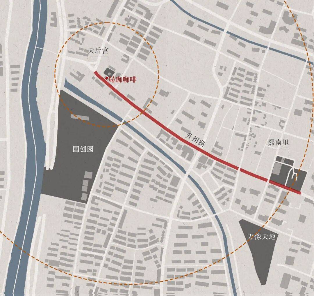 局珈咖啡位于南京老城南地区,这里周边环绕着明清时期风貌的民房,充满了浓厚的历史氛围。店铺面向升州路,道路两旁榕树茂盛,步行五分钟即可到达秦淮河边。在距离店铺不足百米处,还藏着一座清代妈祖道观——天后宫。不同功能属性的房屋交织共生,形成了这片复杂而独特的城市肌理。局珈咖啡就如同镶嵌在这片古老肌理中的一颗现代明珠,既融入其中,又展现出独特的个性。