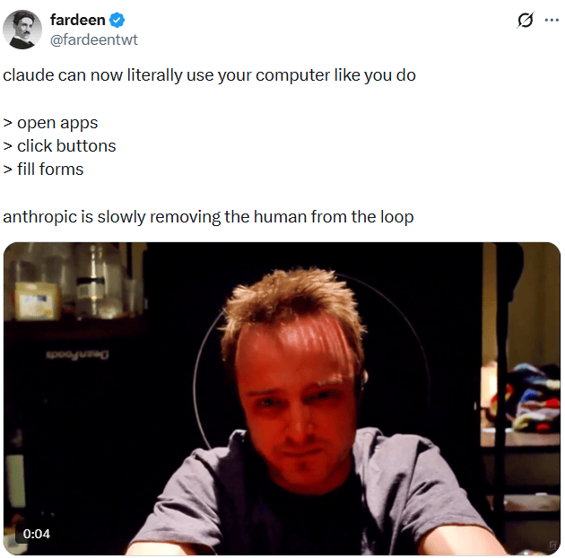 另有用户fardeen则将视角转向Claude最新的能力,评论道:"Claude现在真的可以像你一样使用电脑——打开应用、点击按钮、填写表单。Anthropic正在逐步将人类从操作流程中移除。"