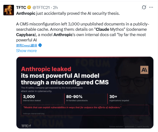 账号TFTC发文直指事件的讽刺意味:"Anthropic不慎证明了AI安全论。一个CMS配置错误导致3000份未发布文件暴露在公开可搜索的缓存中——其中就包括关于'Claude Mythos'(代号Capybara)的详情,而Anthropic内部文件将其称为'迄今为止最强大的AI'。"这一评论在科技圈广泛传播,不少用户对一家以AI安全为核心价值观的公司,竟因基础配置失误而自露底牌深感错愕。