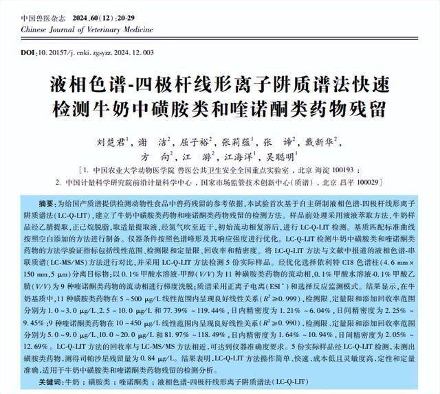 [1]刘楚君,谢洁,屈子裕,等.液相色谱-四极杆线形离子阱质谱法快速检测牛奶中磺胺类和喹诺酮类药物残留[J].中国兽医杂志,2024,