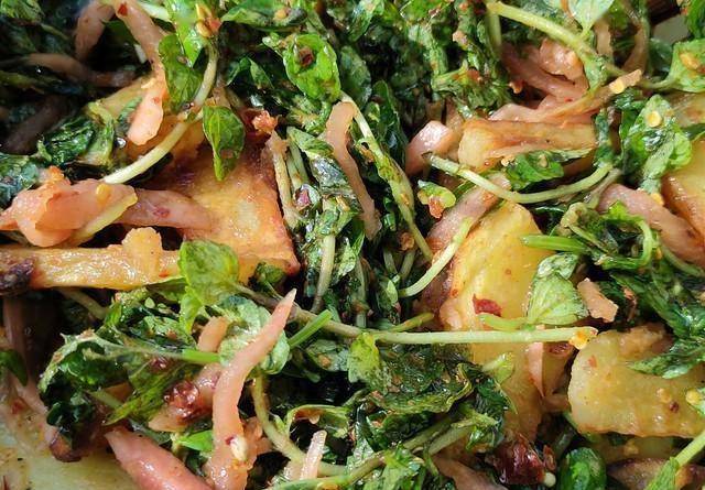 最冤的是木耳菜,被名字耽误一生。落葵才是它本名,高温一煮黏度飙5倍,像自带勾芡外挂。广东阿婆教过:冰水激30秒,葡甘露聚糖“缩骨”,再拍上淀粉炸成天妇罗,松脆到让人忘记它曾是一盘“鼻涕菜”。