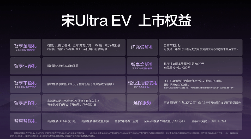 宋UltraEV全系标配超100项实用配置,包括第二代刀片电池及闪充技术、主副驾座椅记忆、带遮阳帘的全景天幕、电动后尾门、15.6寸大屏、前备箱电动解锁、前排远端气囊、螺纹接口等,入门即满配,绝对是2026年最值得入手的SUV。