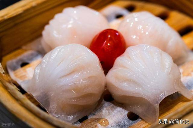 去广东喝早茶,要是不点一笼虾饺,那这顿早茶就算白喝了。虾饺的皮是用澄粉做的,不是面粉,所以蒸出来晶莹剔透,像水晶一样。