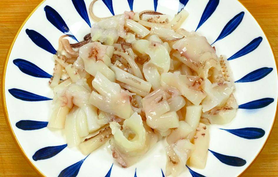 2、烧一锅水,水开之后,往锅里倒一勺料酒,然后把切好的八爪鱼放进漏勺里,再放进沸水里,计时15-20秒。只要八爪鱼的触须卷起来,身体从透明变成乳白色,就立刻捞出来,放进提前准备好的凉白开里过一下。这一步叫“过凉”,能让八爪鱼的肉质瞬间收紧,脆嫩的口感直接锁死,千万别省这一步!