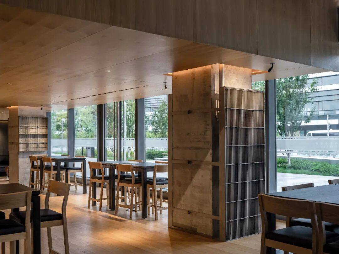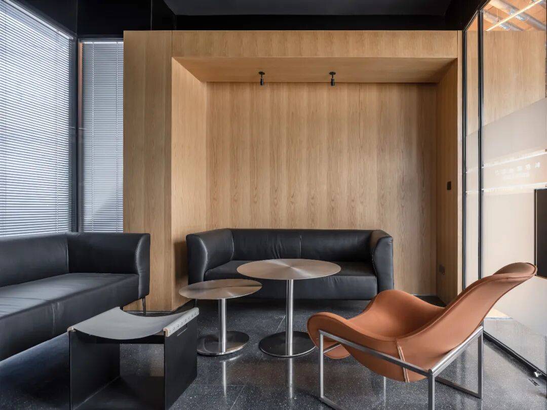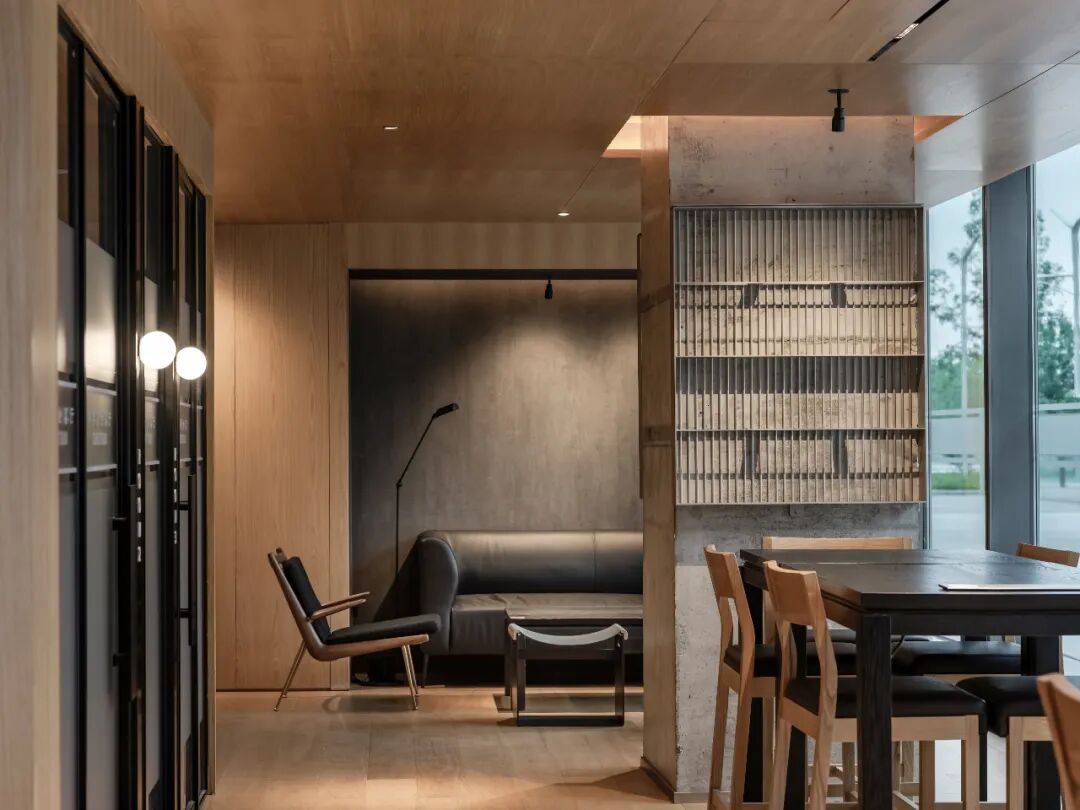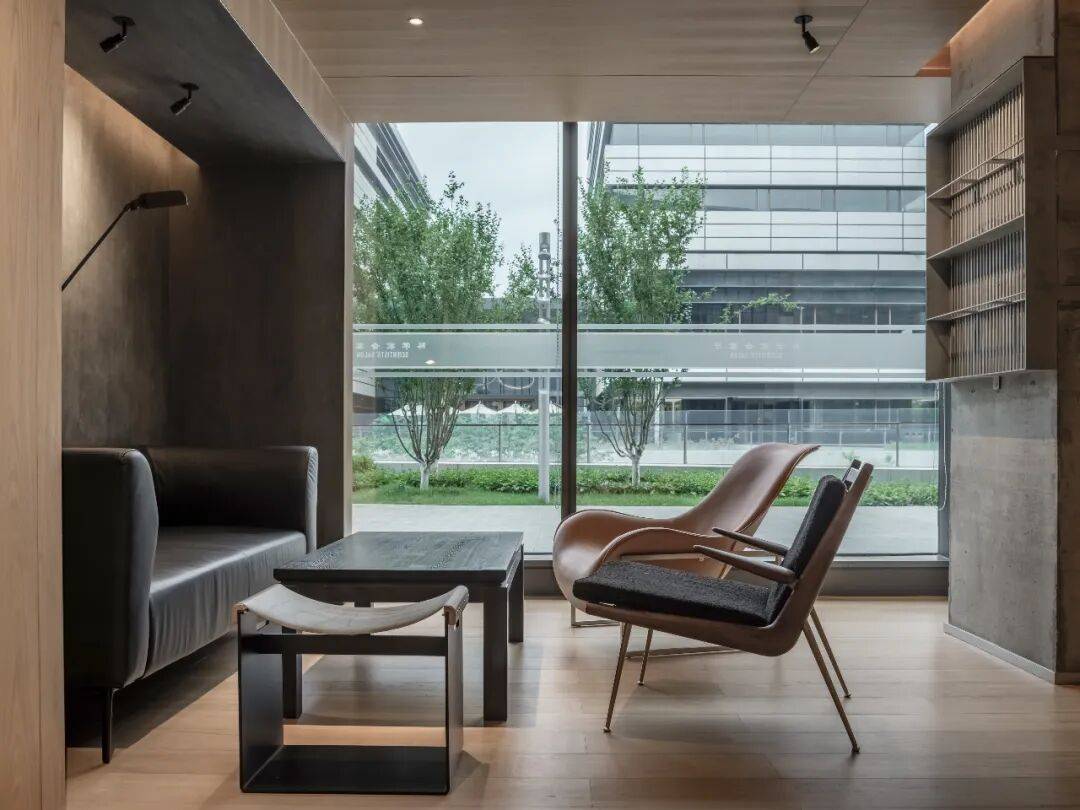 木板被选为水磨石空间主材,是基于场地原本存在的混凝土立柱,被完整保留且未经修饰的立柱,是设计对建筑空间的诚实回应。在这样一个充满思想碰撞的“科学家会客厅”中,理性的思考能够被温暖质朴的氛围所承托,两种材质的对比,严肃又不失活泼。