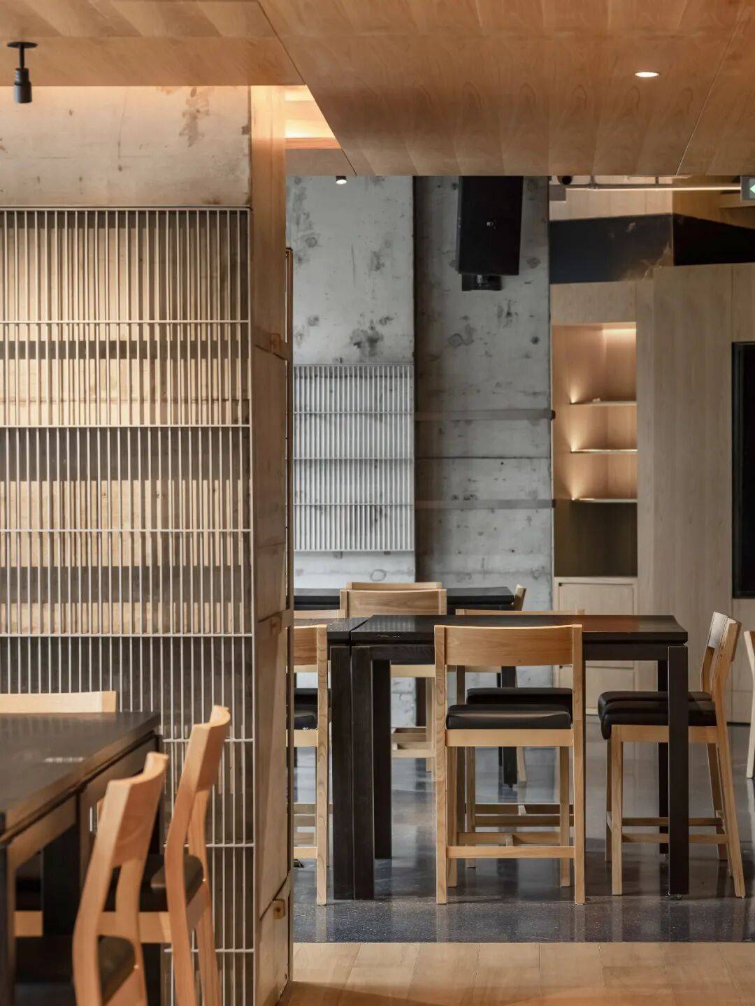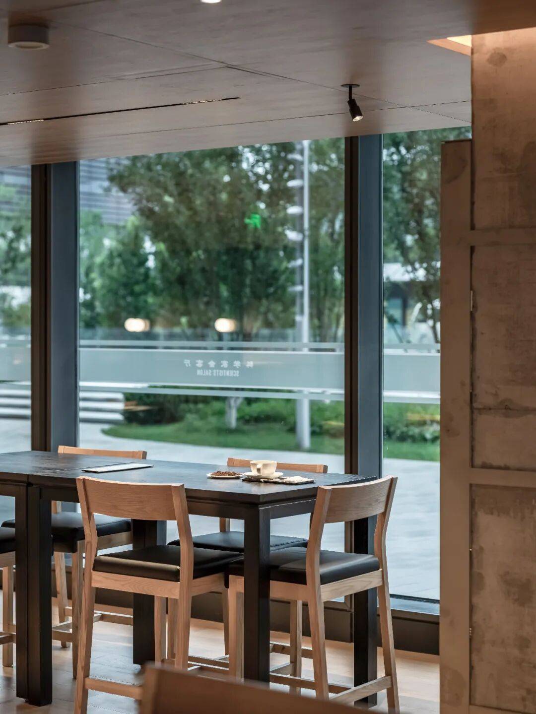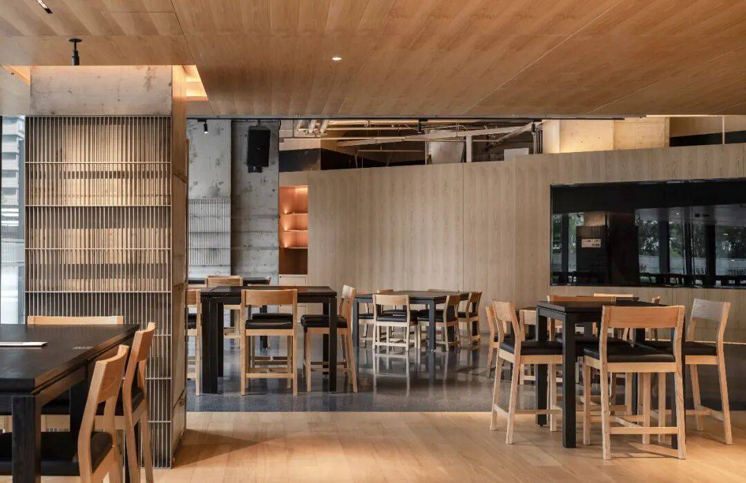 木板被选为水磨石空间主材,是基于场地原本存在的混凝土立柱,被完整保留且未经修饰的立柱,是设计对建筑空间的诚实回应。在这样一个充满思想碰撞的“科学家会客厅”中,理性的思考能够被温暖质朴的氛围所承托,两种材质的对比,严肃又不失活泼。