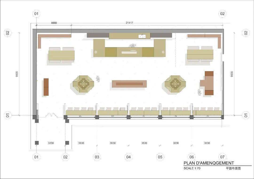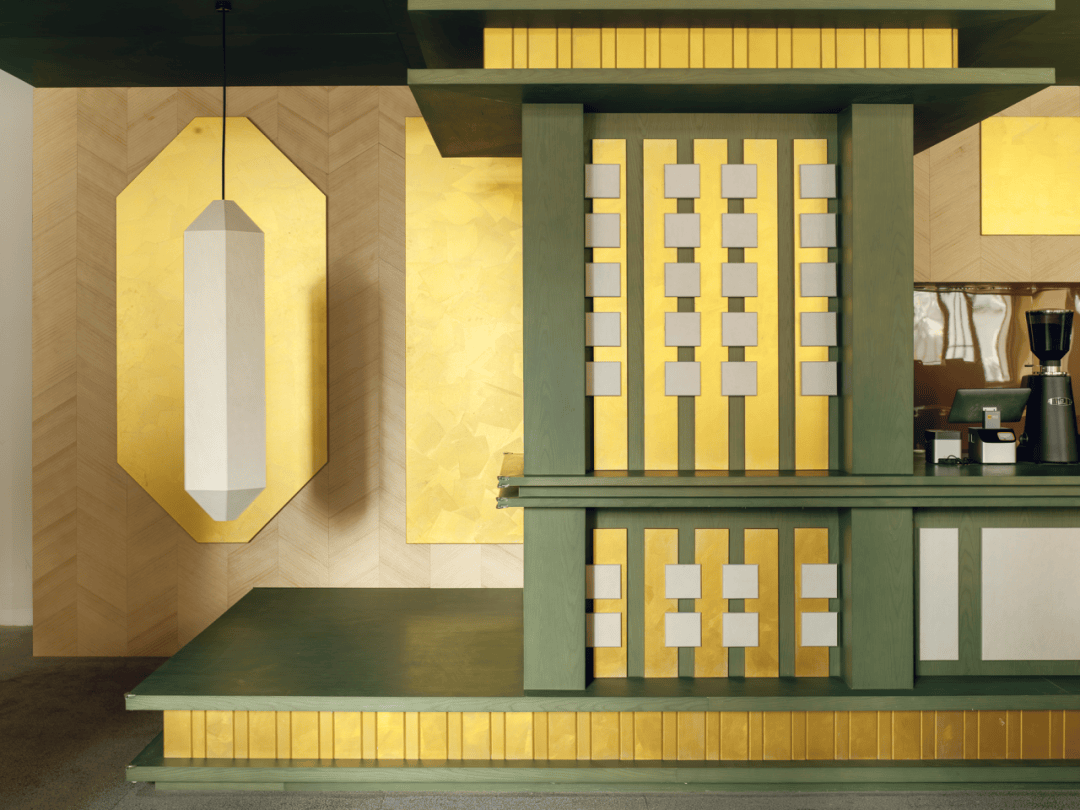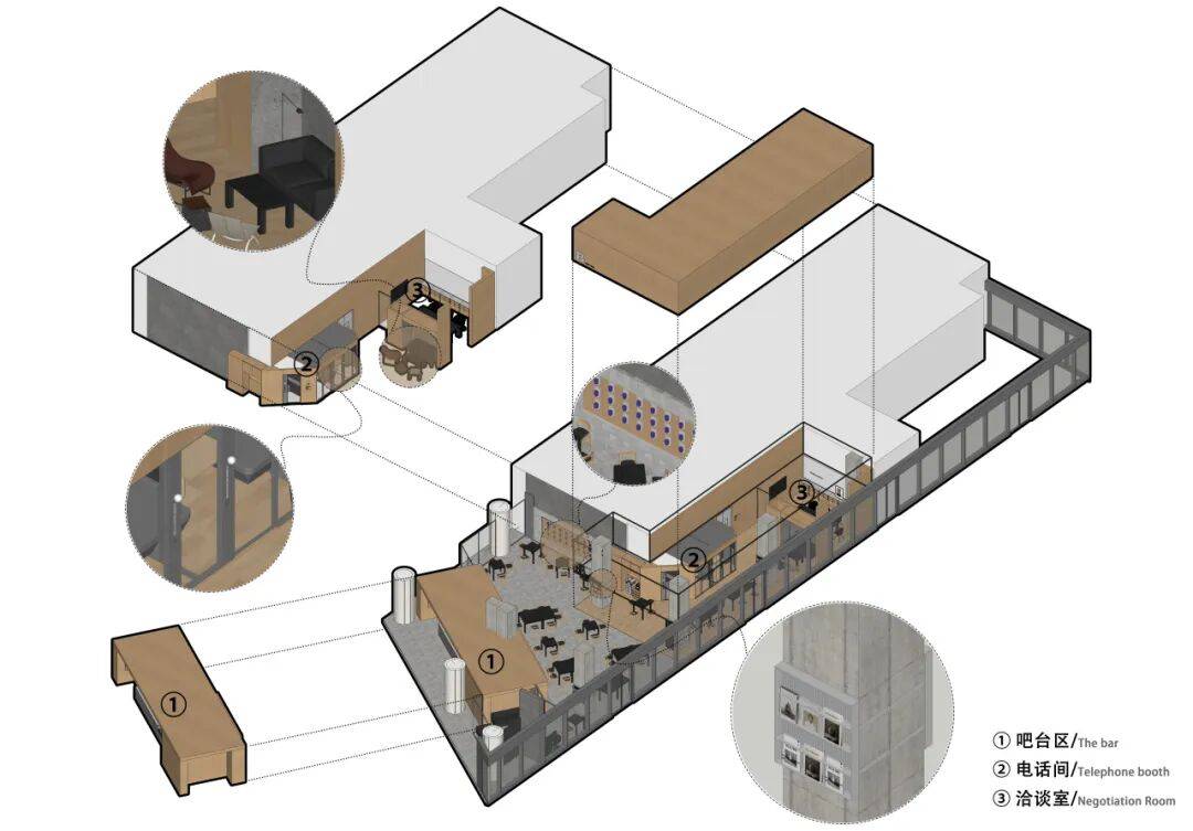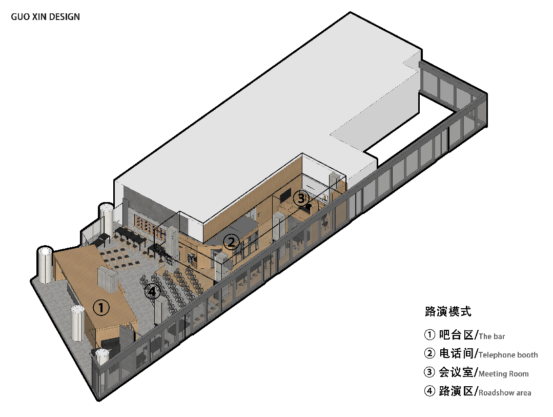 项目所在区域位于办公楼一层西南角,西侧的玻璃幕墙提供了充足的采光,东侧与北侧朝向办公楼内部。咖啡制作和售卖区的吧台被放置在紧邻办公楼入口的一侧,以方便来往人群关注到这里。吧台呈斜向排布,顺应场地形状。