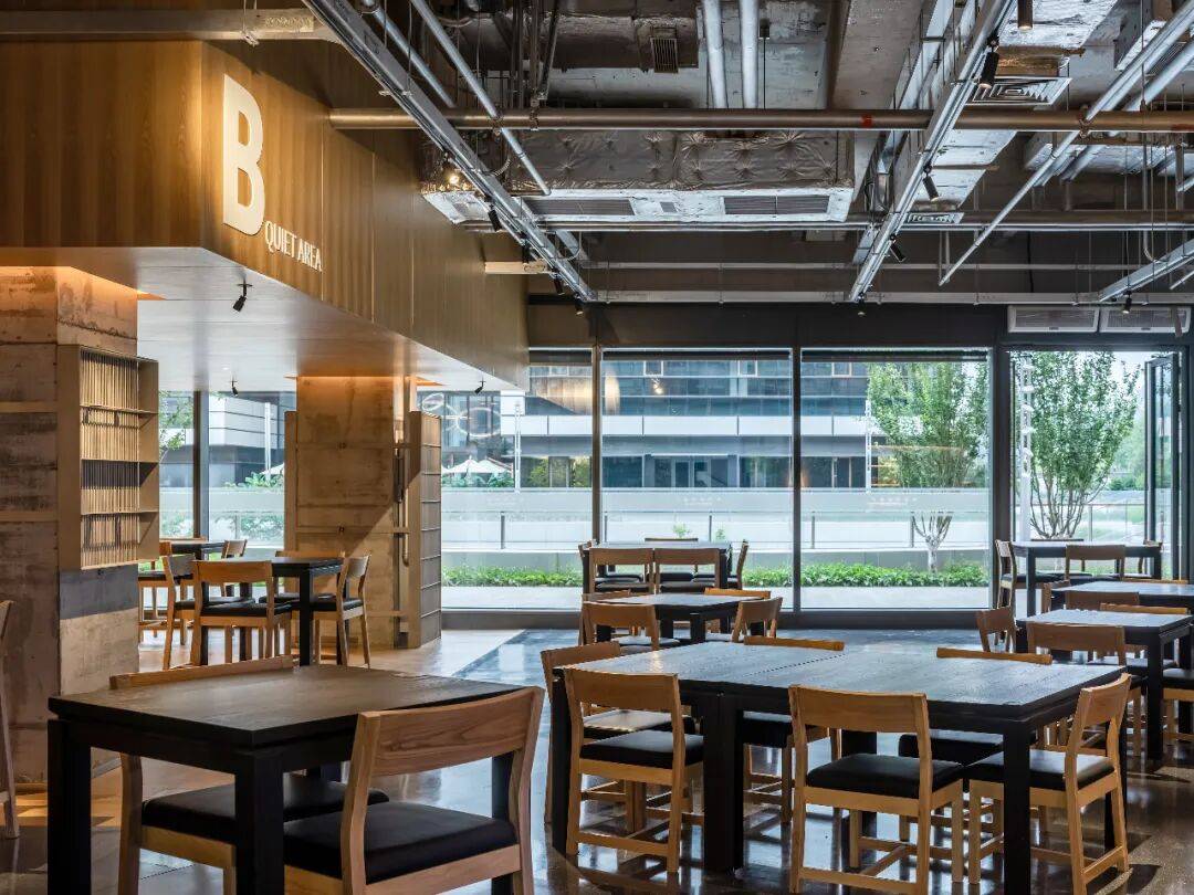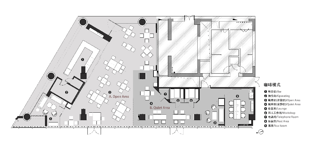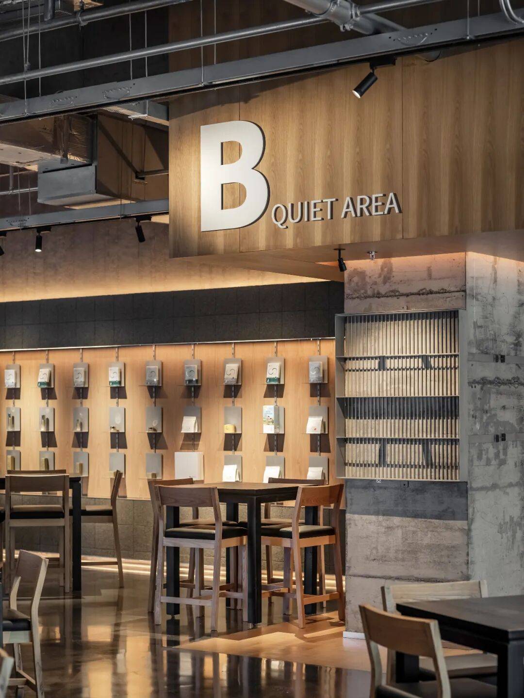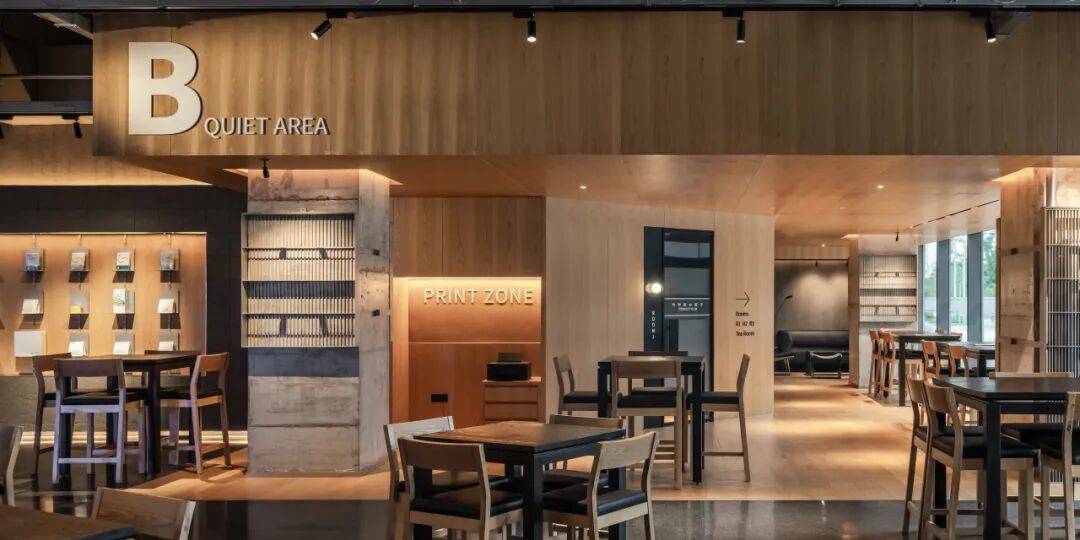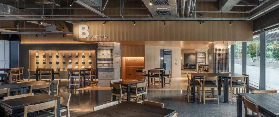 在设计过程中,充分考虑到用户在不同声音分贝下的学习和办公需求。穿过吧台的内部空间,规划出A、B两个模块,A区为开放区域,可供交流、分享;B区为安静区域,适合办公、学习。此外,在相对安静的B区,同时开辟出单独的电话间和工作间,以满足多重使用需求。