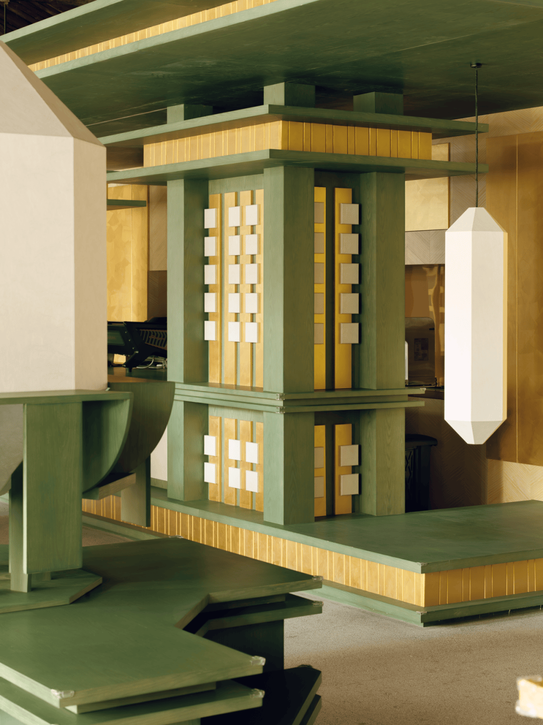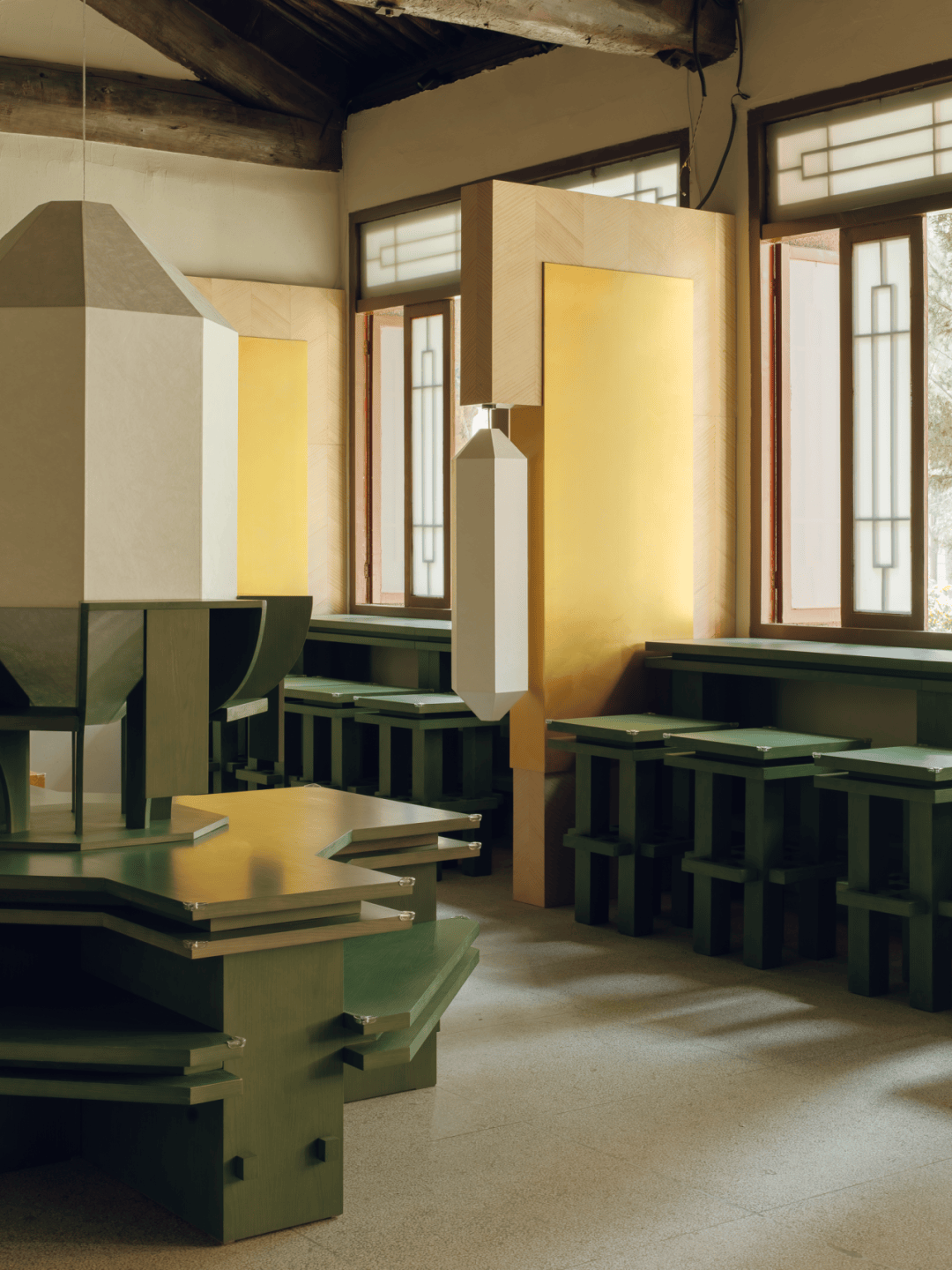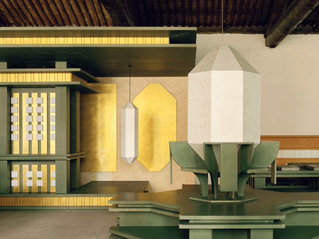 家具与展陈系统的设计深度呼应建筑结构语言:所有桌椅、展柜、体验台均以唐代木构建筑的梁柱、斗拱形制为原型,通过放大体量、简化线条的方式,打造出兼具功能性与雕塑感的定制化构件。家具布局全程规避与古建原始梁柱的直接触碰,以“悬浮式”“围合式”排布实现功能与古建的和谐共生。
