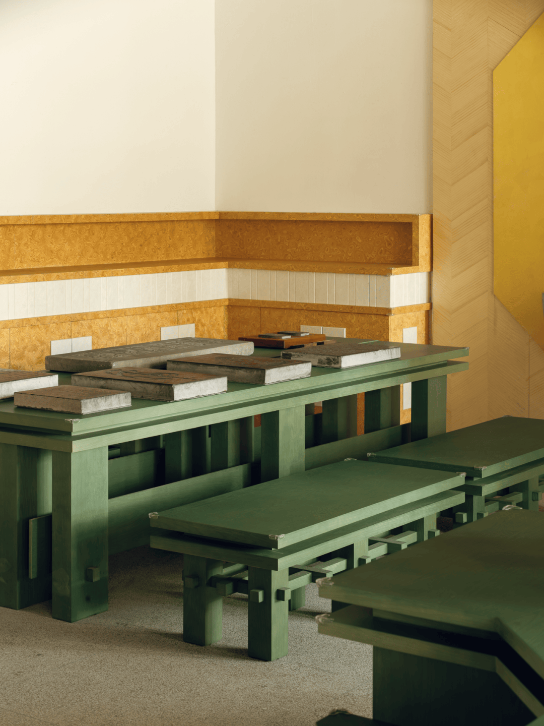整体设计以唐代美学风骨为脉络,萃取碑林园区古建筑外立面的青绿色作为主色调,搭配明艳的金色点缀,还原唐代建筑浑厚大气、色彩浓艳的视觉特征。空间营造上采用“大空间嵌套小空间”的手法,在完整的古建格局内,依托功能划分构建出相对独立的休憩区、文创区与拓印体验区。