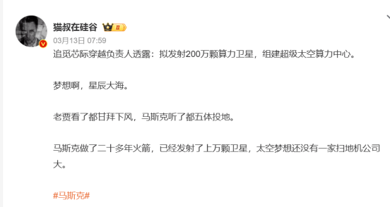 倒是硅基人对此表示理解:“我看了一下,这200万颗是未来几十年的终极目标,现在只是发射第一颗做技术验证。这就像马斯克当年说造火箭一样,先迈出第一步试试水温,离真正铺开还有很长的路要走呢。”