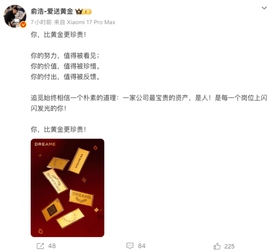 俞浩还把自己的微博名称改成了“俞浩-爱送黄金”,他还经常为这些惊人之言点赞的粉丝送出真黄金。甚至宣布在常规年终奖之外,奖励全体员工每人1克黄金,价值约2600万元。