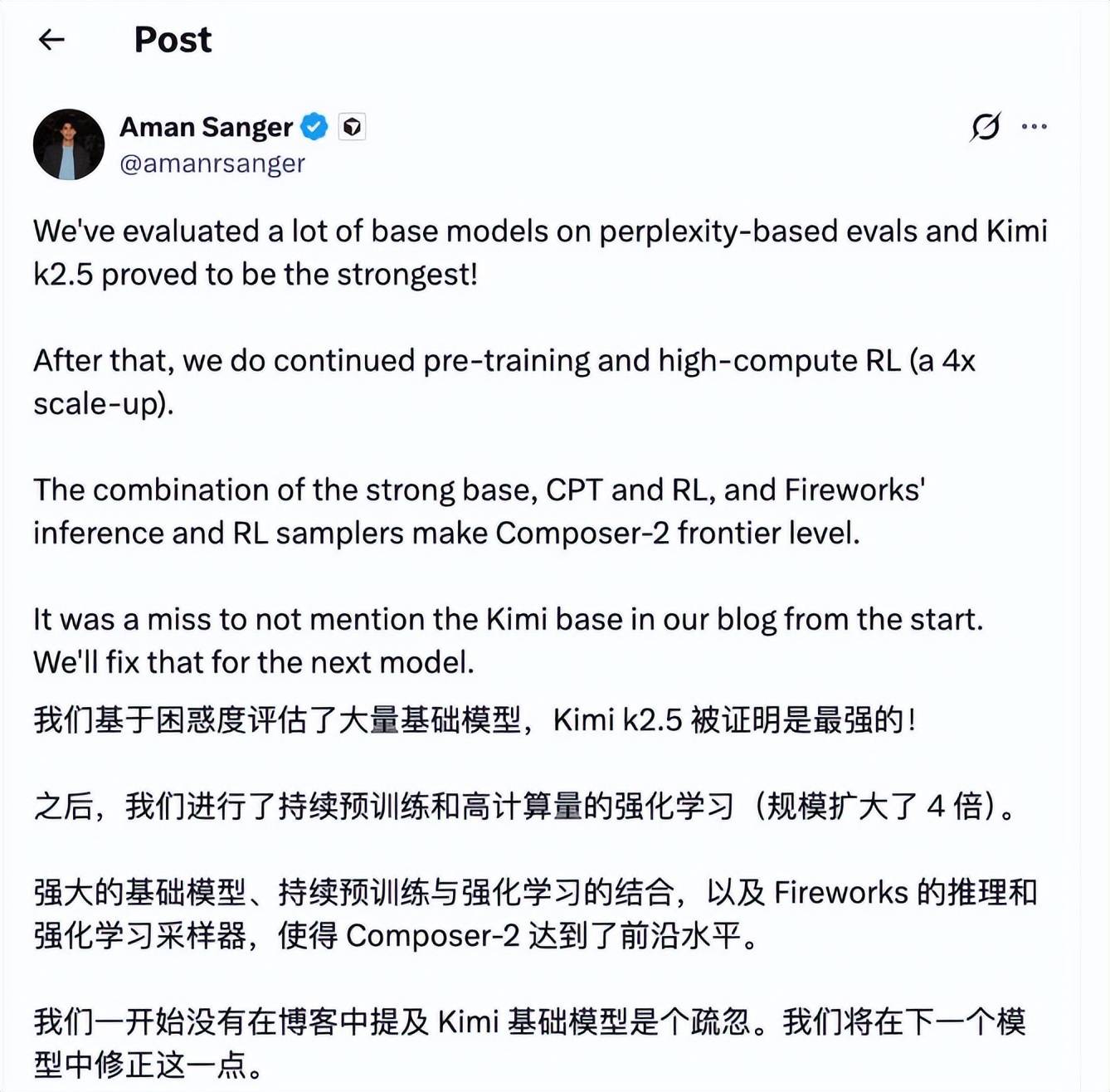 他们的新代码模型 Composer 2,其实是基于中国企业“月之暗面”的开源模型 Kimi K2.5 二次开发的,月之暗面方面也确认了双方的授权商业合作。