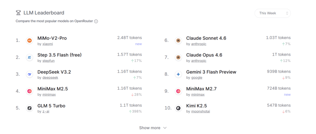 在本周的大语言模型热门榜单前十中,中国模型占据七席,小米最近发布的 MiMo‑V2‑Pro 更是位列首位。