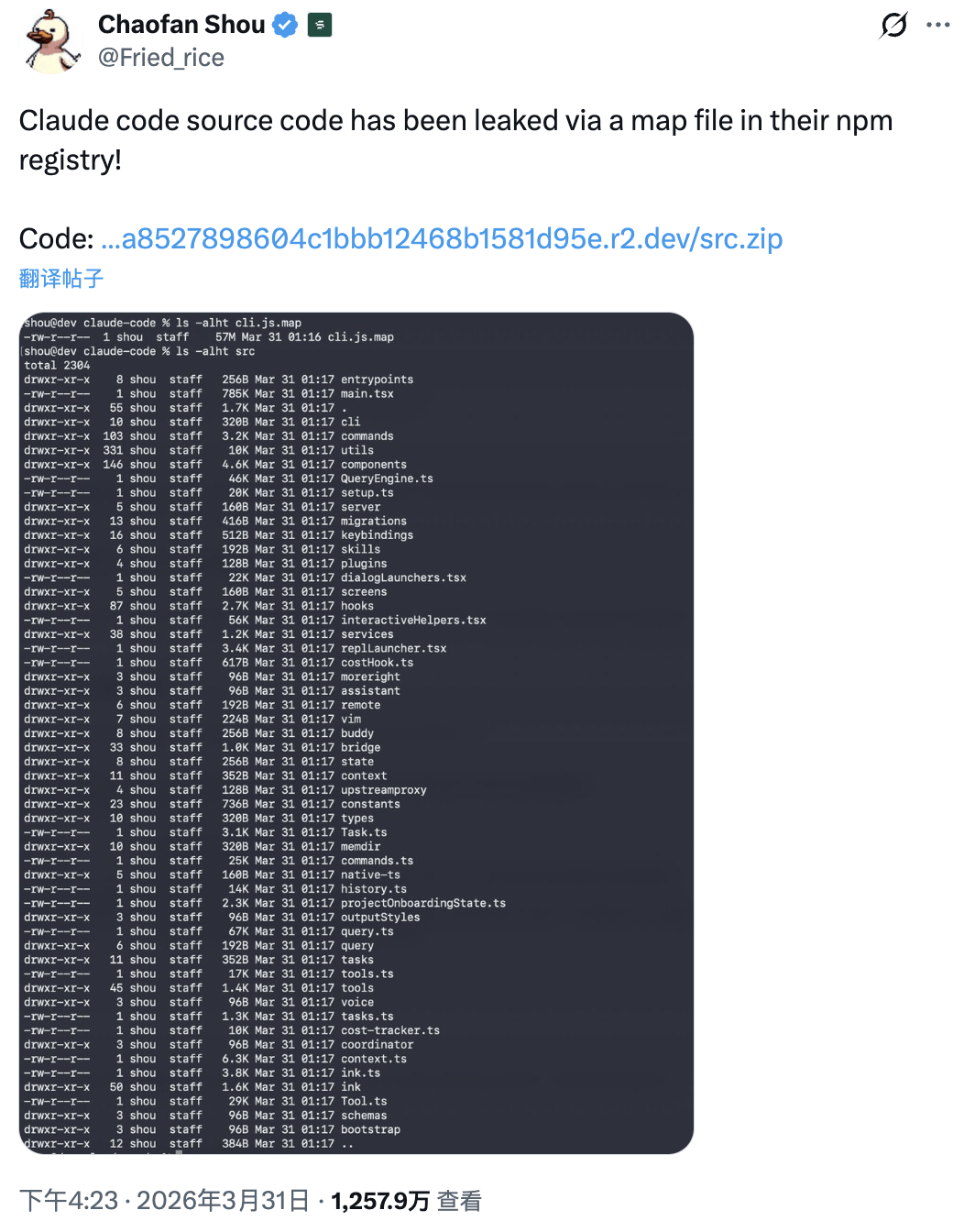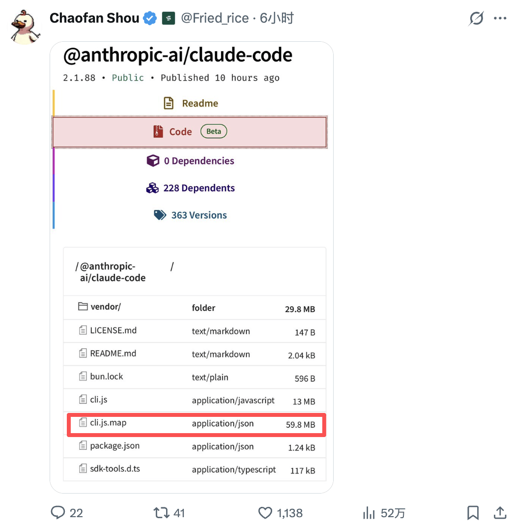 区块链安全公司Fuzzland研究员Chaofan Shou在X上率先曝光了这一事件。Anthropic官方npm软件包@anthropic-ai/claude-code版本2.1.88中,意外包含了一个约60MB的cli.js.map文件。