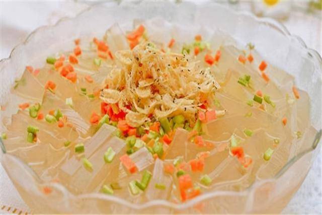 4、凝固好的海草冻倒扣出,用刀子切成小块,淋上蒜汁,放上黄瓜丝,淋上辣椒油即可食用。