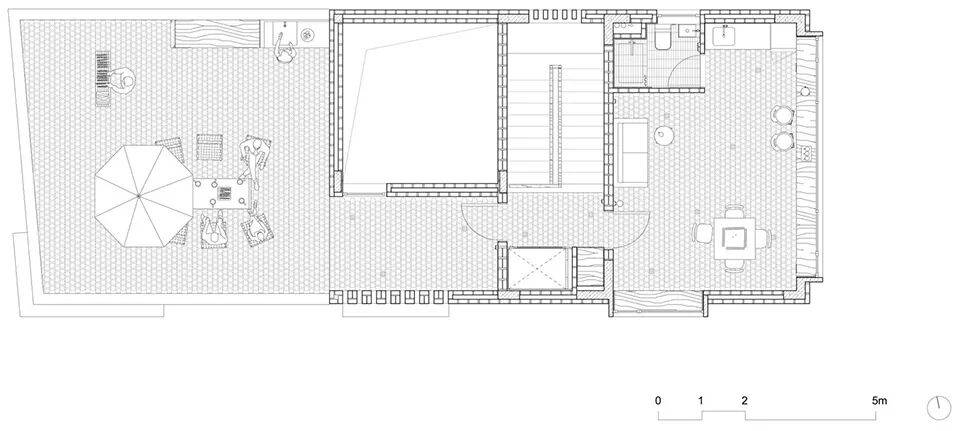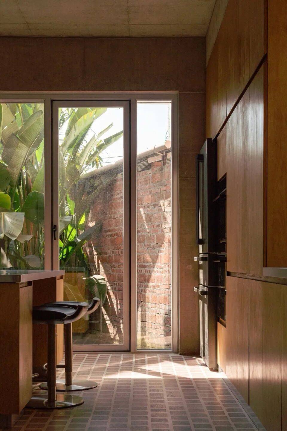 相对亲近的朋友可以进入由厨房、餐厅和客厅组成的生活和接待空间。这个空间向相对私密的后院敞开,将生活向室外延展。后院保留着上一辈种植的荔枝和黄皮,部分爬有植物的院墙也留了下来,承载着家族的记忆和情感。