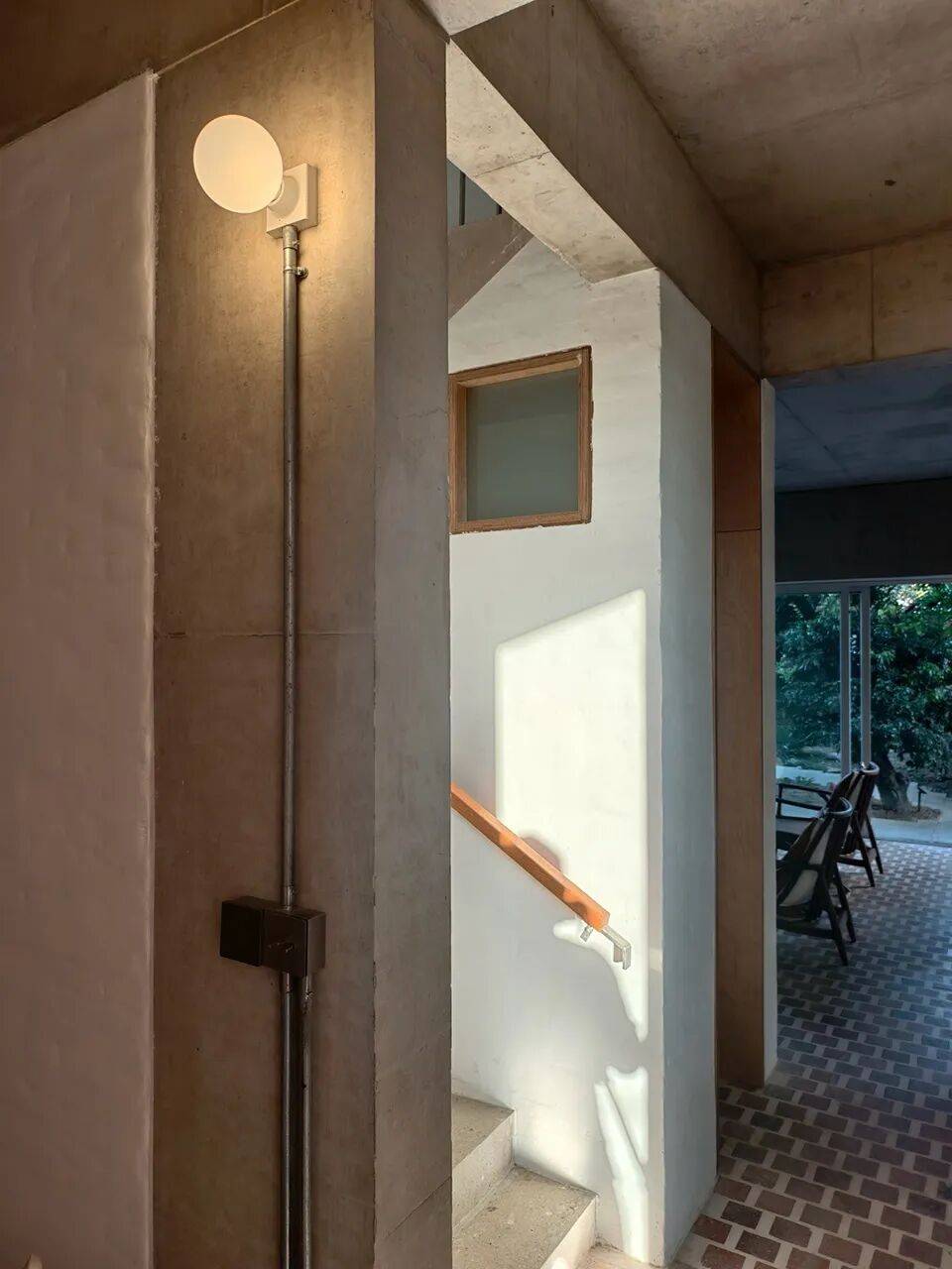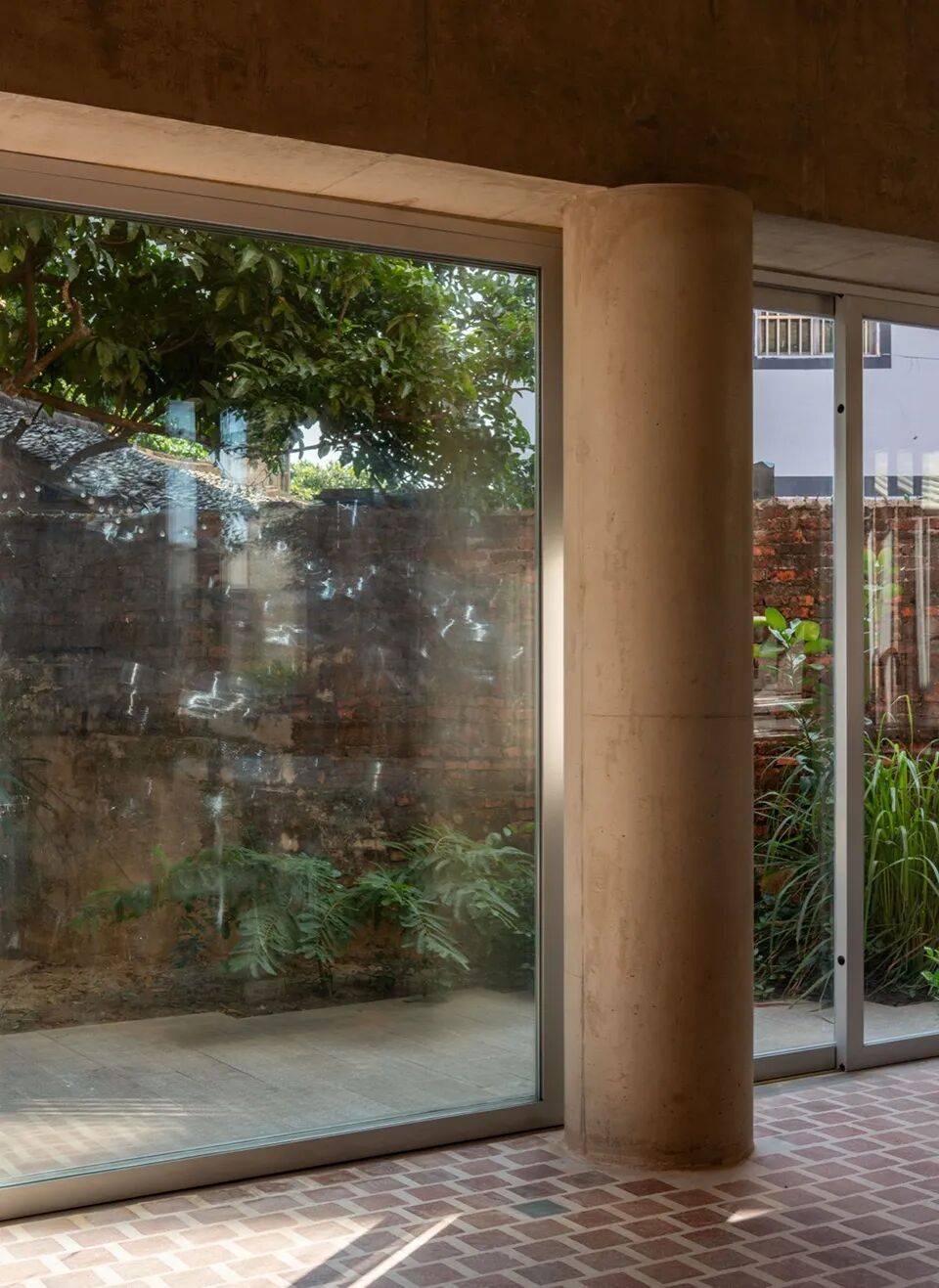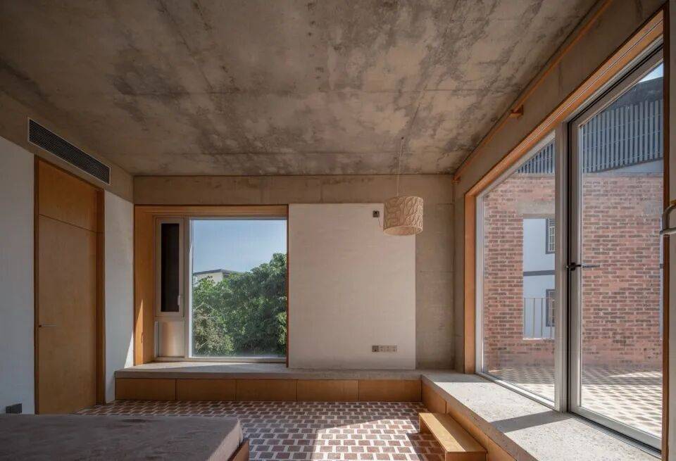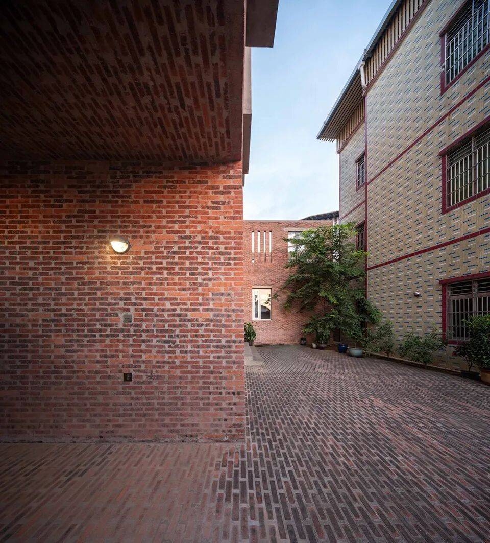 建筑采用双层中空外墙,这一设计对广东地区直射光的隔热尤其有效,增强了建筑的热工性能。双层中空外墙的采用,使得建筑内外呈现出两种不同的面貌。建筑外是一个融入当地的、朴素的、嵌着混凝土窗套的红砖房子;建筑内则清晰地呈现钢筋混凝土框架和围护砖墙,框架与围护形成有关图底关系的游戏,在外部隐藏、在内部呈现,通过建造逻辑的展现营造出空间的氛围和气质。