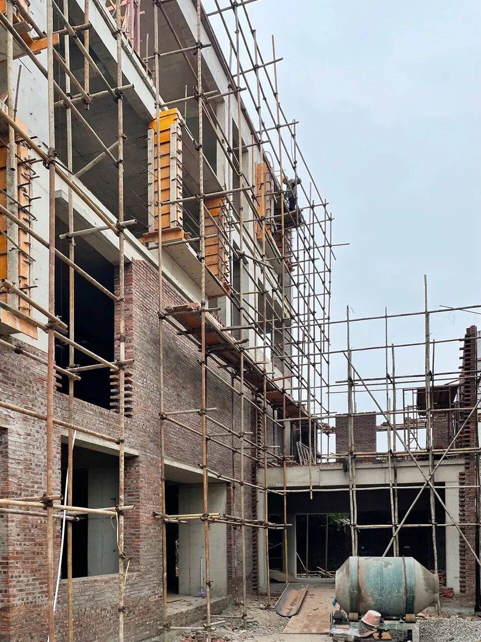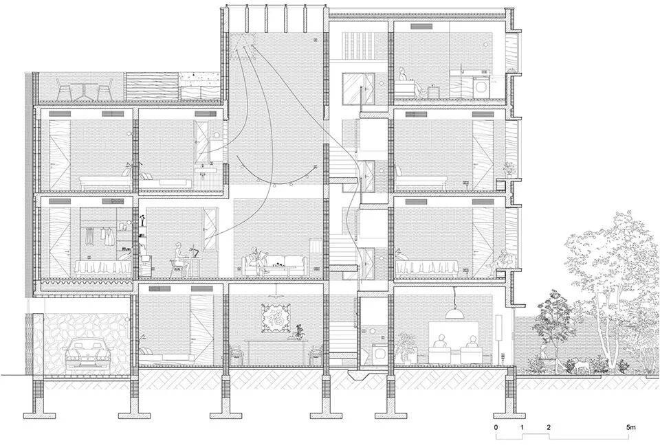 建筑整体结构为钢筋混凝土框架,双层中空外墙内侧与框架齐平,呈现框架与墙体关系,建造关系可读;外侧则隐藏框架,呈现统一红砖肌理,形成内外解读的差异。中空砖墙外侧包裹结构,内侧与结构并置,两侧墙体通过不锈钢网片拉结,并与结构主体通过植筋连接,同时利用中空位置预埋线管。