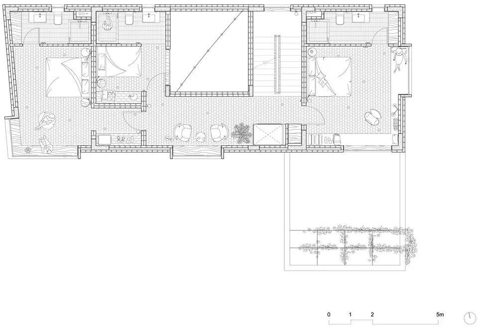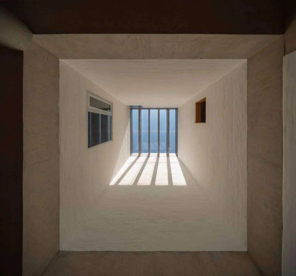 位于二楼的家庭室是另一个公共空间,相对于一楼的客厅,家庭室内向和私密,四周包裹,向天空敞开。其空间形态希望回应老宅堂屋——通高、顶部采光、通风窗,同时与客厅形成了体验上的差异,构成了由堂屋 - 客厅 - 家庭室逐渐私密的空间序列。