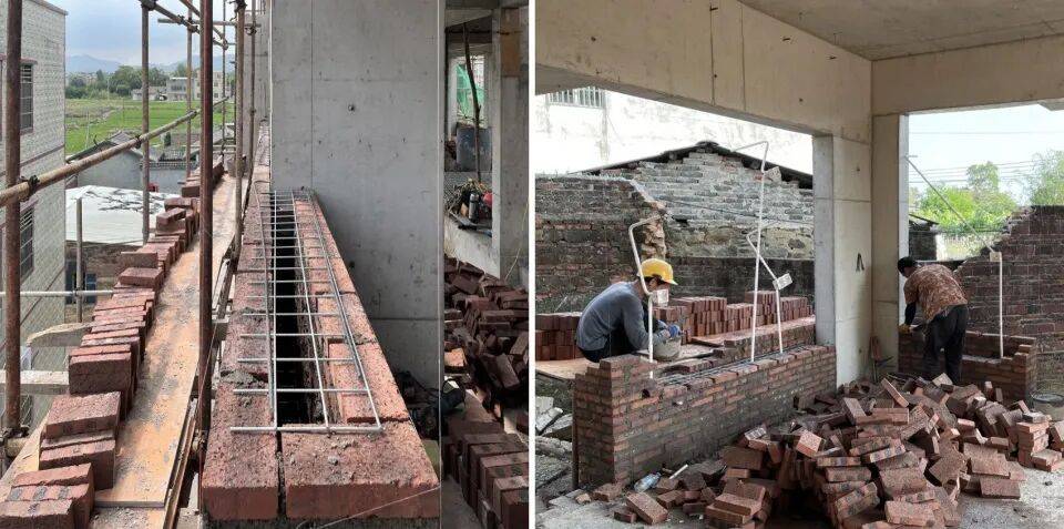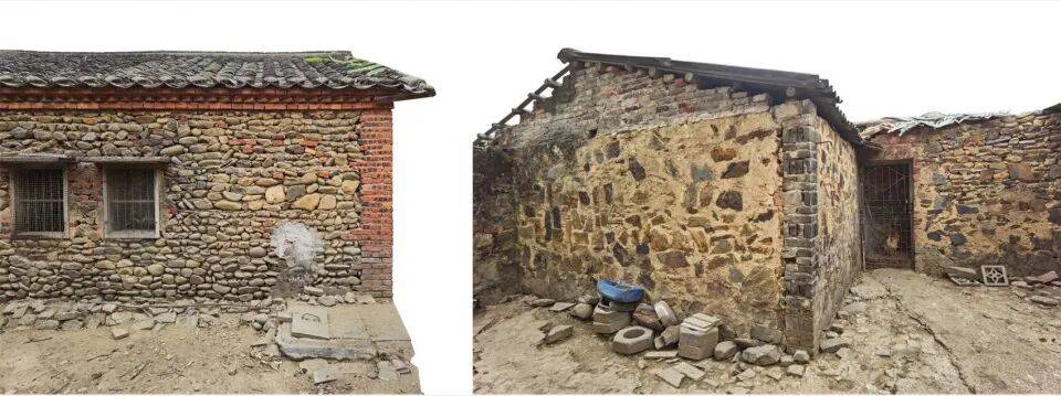 第一次来到现场,设计团队就被村里老屋清晰的建造关系所吸引。在物质匮乏的年代,村里老房子的砖只用在墙转角、墙压顶、门窗框四周等需要相对平直的位置,墙的其他部位则填充当地河里掏的大卵石、山上开采的炮石或就地制作的土坯砖。这种朴素的建造方式,巧妙且经济地利用了不同材料的物理特性。
