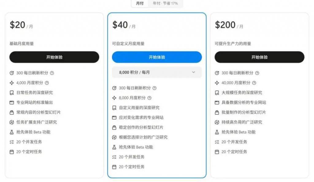 其付费订阅价格被不少用户认为偏高,元素记者从其官网查看到,基础月度用量 20 美元 / 月,可定义月度用量 40 美元 / 月,可提升生产力的用量 200 美元 / 月,显著高于字节跳动旗下竞品扣子海外版的定价。