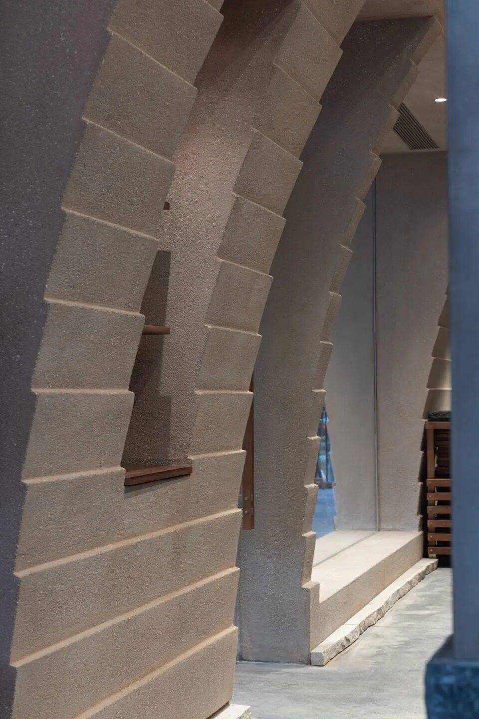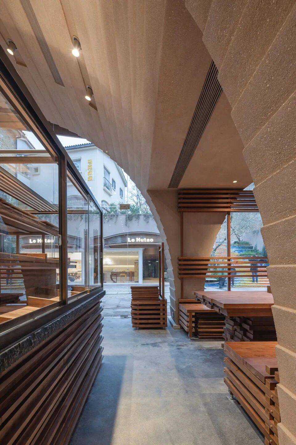 2. 素材选择与呼应:空间以基础的砂、石、木为主要素材,呼应自然发酵所需原料的基础与纯粹。采用水洗砂统一室内外材质,平衡自然感与耐用性;踢脚由石材废料切割拼接;桌凳和面包柜将旧木抛光再利用,呈现不规则随机感。将生长的空间形态、秩序的结构与自然素材整体构筑,让时间成为盟友并被感知。