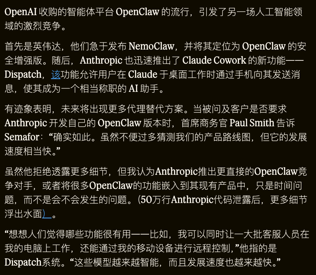 科技媒体Semafor今早报道,Anthropic首席商务官Paul Smith被问到客户是否在要求公司做一个自己的OpenClaw,他承认的确如此。