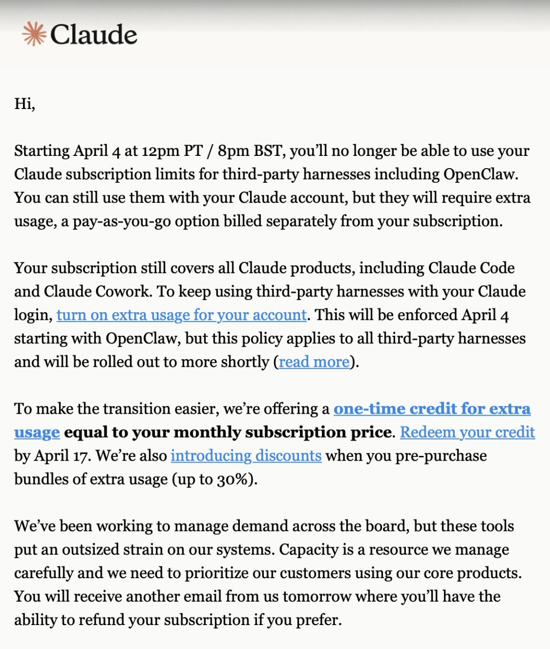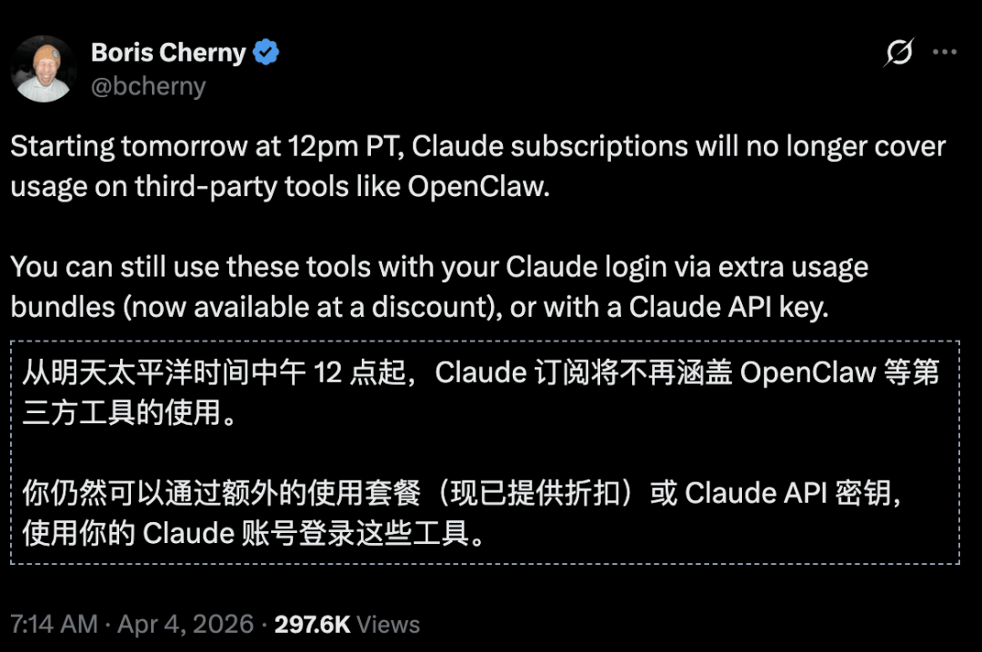 此政策将于4月4日起率先在OpenClaw上强制执行,但适用于所有第三方工具链,并将很快推广至更多工具。
