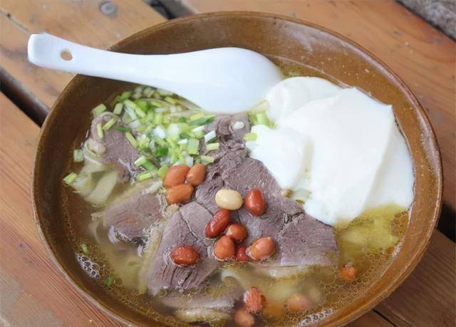原料:宽刀面条300克、熟鸭肉片50克、嫩豆花100 克、油酥花生米15 克、葱花3 克、油辣椒10 克、