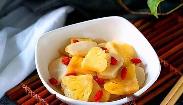 【做法】1、准备好所需食材,另外泡几颗枸杞子做装饰之用,将菠萝切薄片