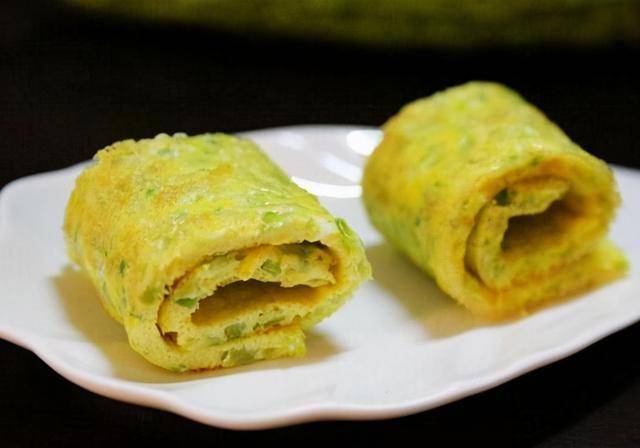 3.锅里抹一层薄薄的油,将鸡蛋打散摊成蛋饼,随后切成细丝。荷兰豆放滚水中焯熟后切成细丝 。