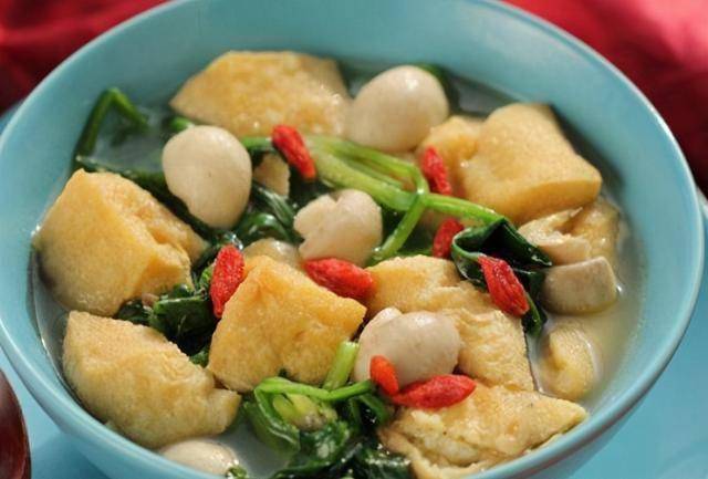 材料:菠菜1小把、豆腐泡20g、口蘑100g、虾皮1小把、油适量、盐适量、姜蒜末适量