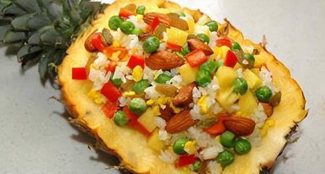 做法1.菠萝一个,沿三分之一处切开,将菠萝肉取出,用刀切几条用勺取出菠萝肉,并用刀切成块