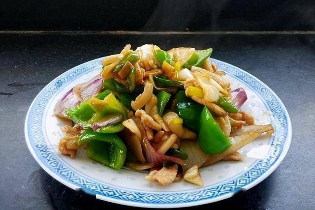 (3)炒锅再加少许油烧热倒入青椒丝翻炒。