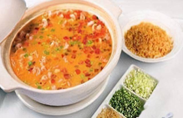 老鸡、鲜虾经过5小时的熬制成汤,起菜时,只需将虾仁、时蔬、米饭倒入汤中,搅拌均匀,配上其他小料上桌即可。此菜上桌速度极快,特别适合宴会时推出,烫饭上桌后,客人可自行加入炸香米,味道非常香浓。