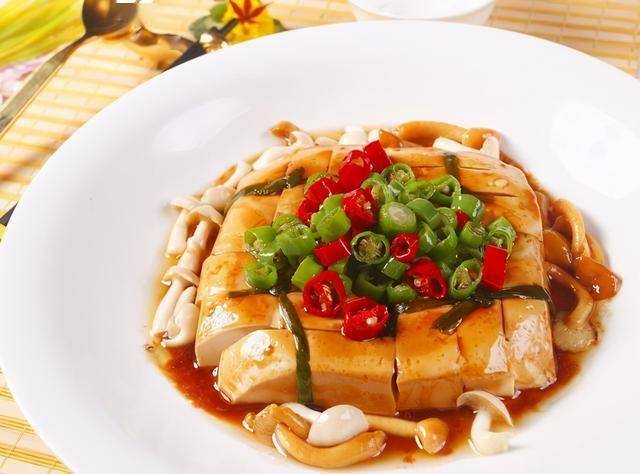 2.碗内加入熟鸭肉片、嫩豆花,调入盐、味精、鸡精、酱油、花椒粉、胡椒粉、化猪油,舀入热猪骨鲜汤,撒入葱花即成。