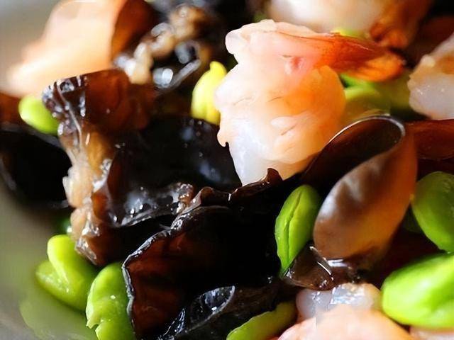 材料:蚕豆100克、黑木耳100克、虾仁100克、盐少许食用油少许