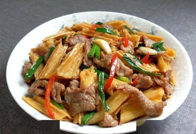 放剁椒,蒜片,料酒,生抽,蚝油,半勺水焖入味。再放入腐竹翻炒,汤汁快干时放青椒片,盐,鸡精调味