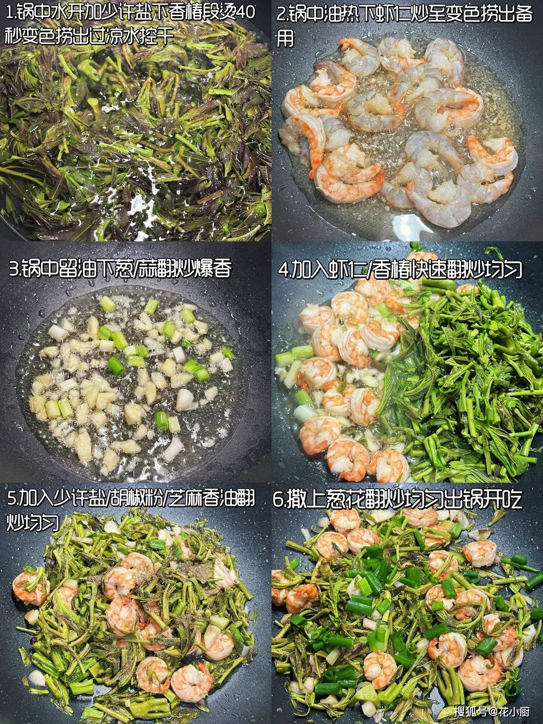 3️⃣锅中留油下葱/蒜翻炒爆香/4加入虾仁/香椿快速翻炒均匀,加入少许盐/胡椒粉/芝麻香油翻炒均匀,撒上葱花翻炒均匀出锅开吃。