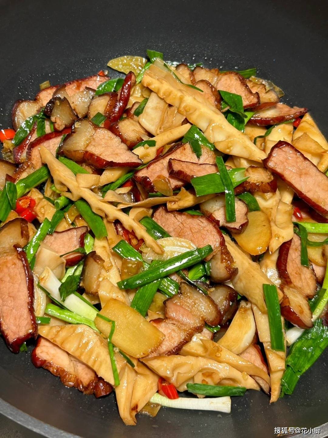 2️⃣少许油下腊肉炒变色,放姜蒜、泡椒、小米椒炒香,放入竹笋翻炒均匀!