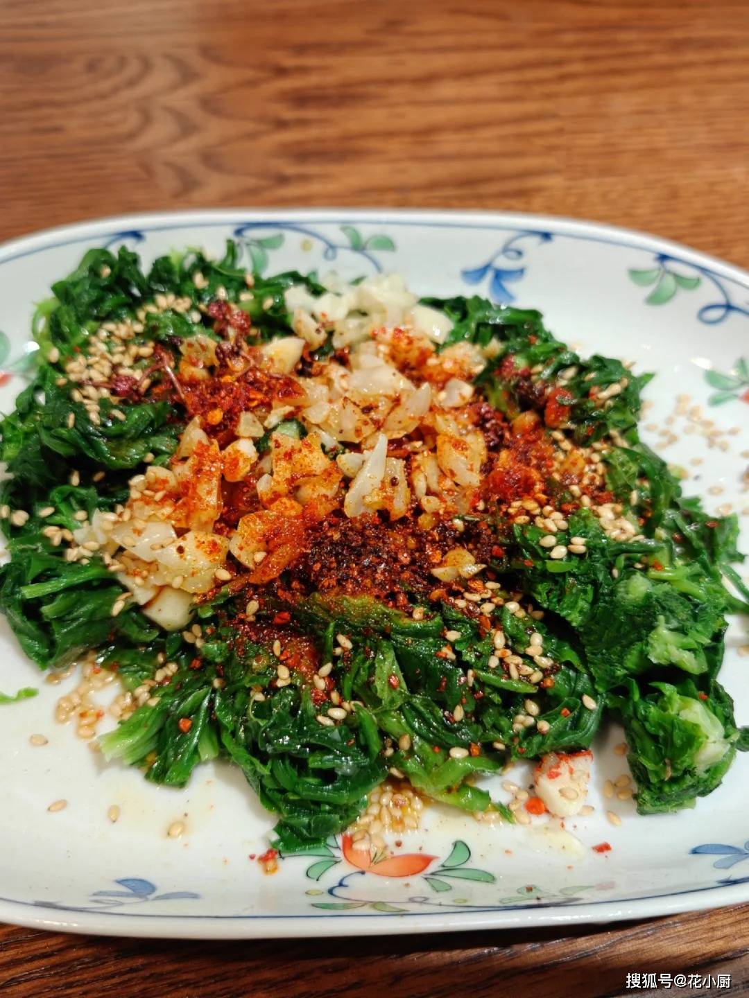 3️⃣荠菜切段装盘,铺蒜末+白芝麻+面辣椒,泼热油,淋上生抽、香醋、糖就完成了!