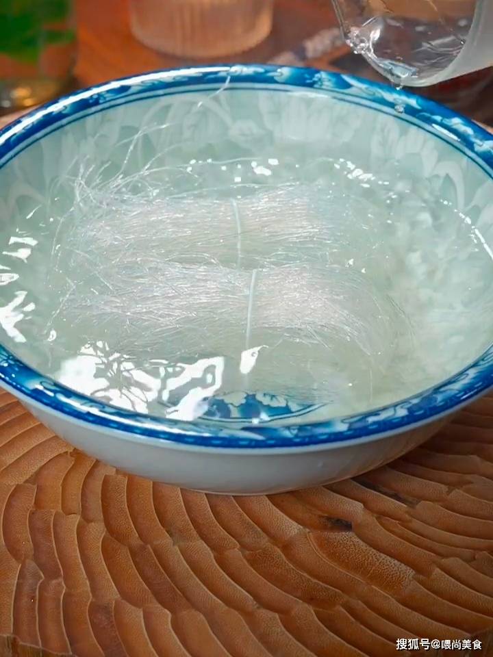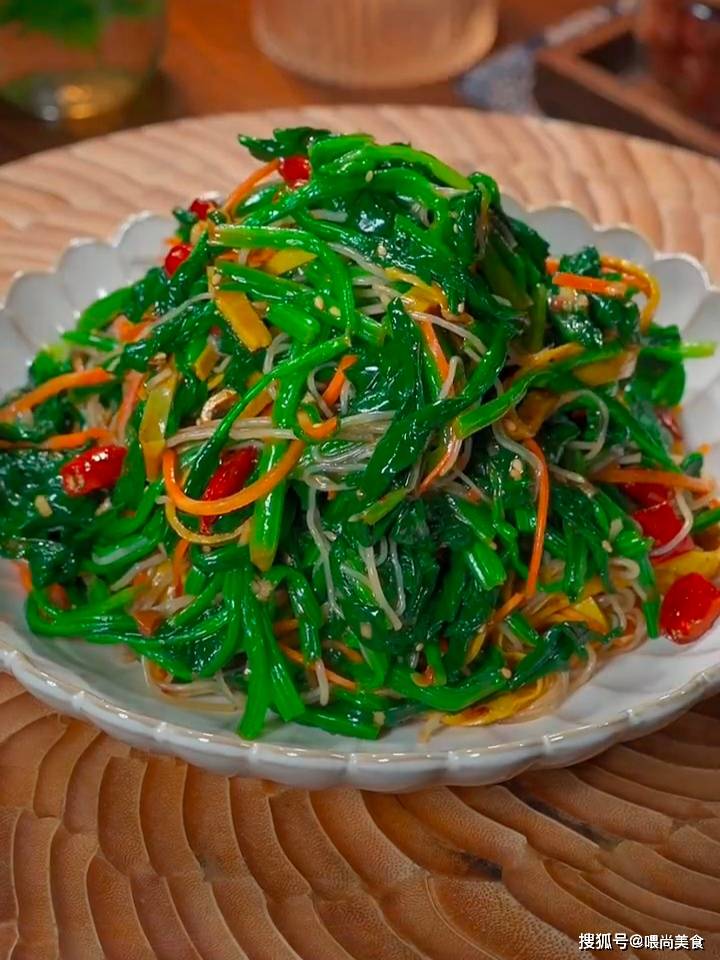 3、起锅烧水,水开放入菠菜,加入少许的食用油和1勺盐,这样烫的菠菜颜色比较绿,营养还不流失,焯水2分钟捞出,用冷水投凉,挤干水分后放入盆中,再放入粉丝、胡萝卜丝、花生米,备用。