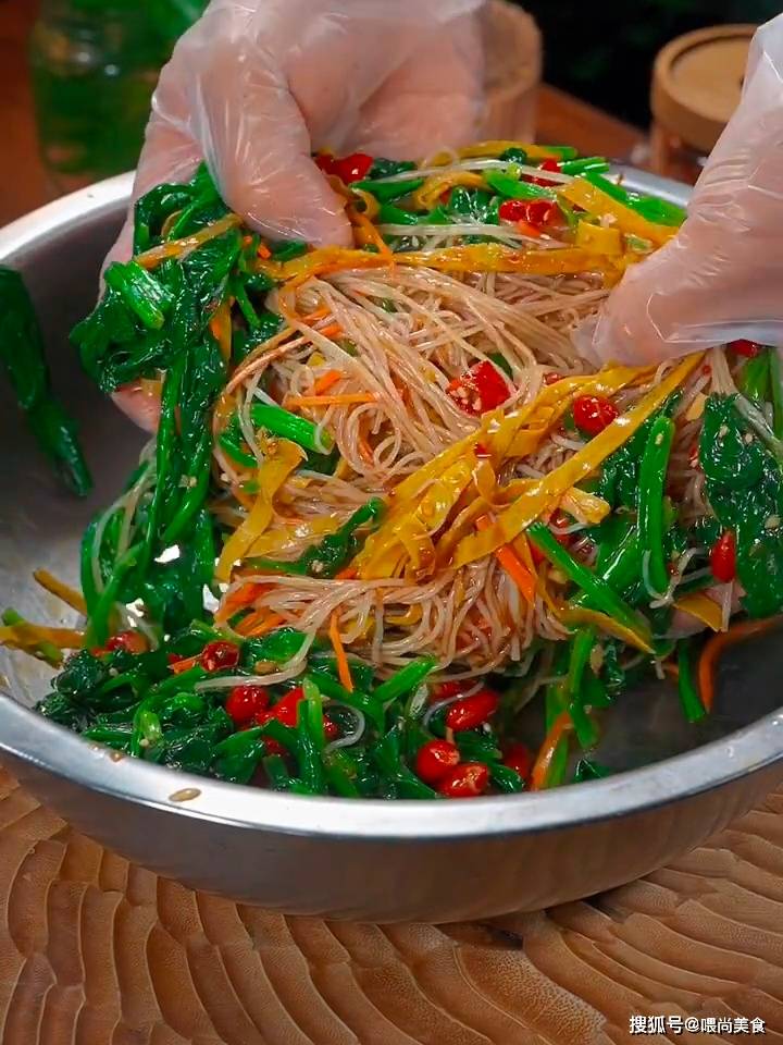 粉丝、菠菜、胡萝卜、鸡蛋、花生米、干辣椒段、芝麻、蒜。
