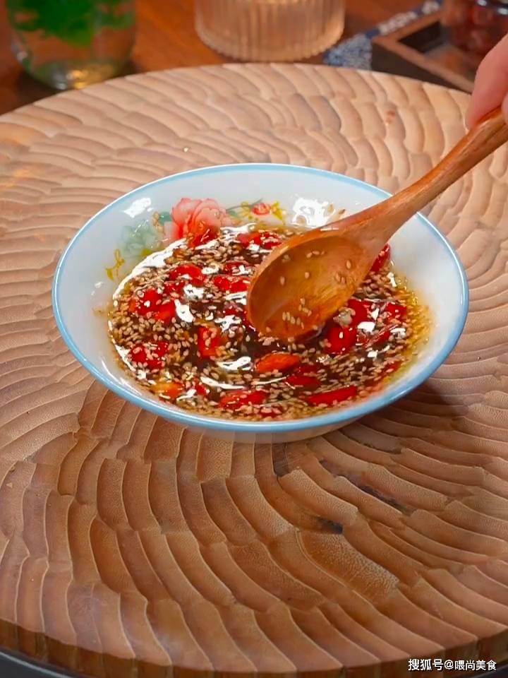 4、空碗中放入蒜末、干辣椒段、芝麻,淋入热油,激发出香味,加入1勺生抽、1勺香醋、1勺盐、1勺鸡精、1勺白糖,搅拌均匀,淋入盆中,翻拌均匀即可。