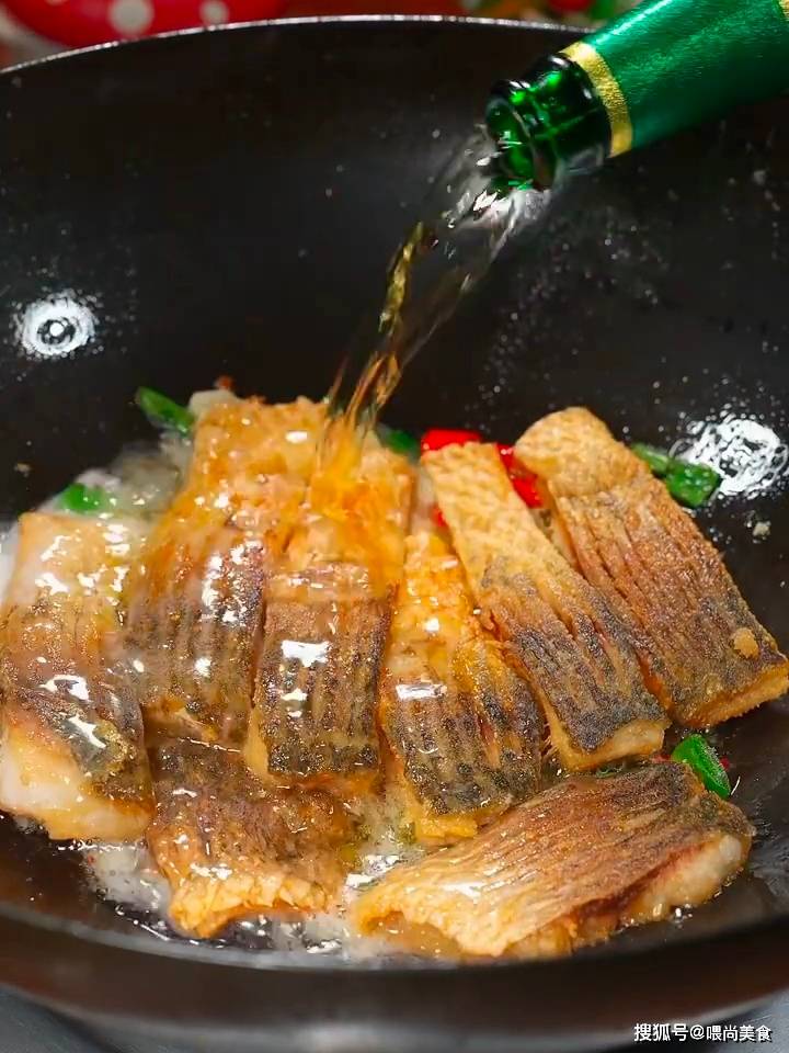 3、放入鱼块,倒入一罐啤酒去腥,加入1勺生抽、1勺蚝油、少许老抽、1勺盐、1勺鸡精、1勺胡椒粉,倒入没过鱼块的清水,小火慢炖10分钟,再撒上葱段即可。